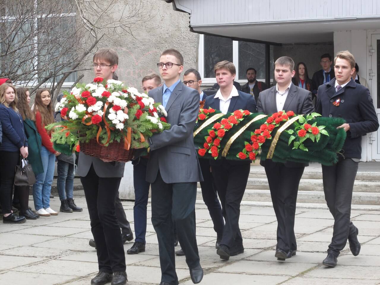 5 мая в учебном корпусе № 6 Иркутского государственного университета состоялось торжественное возложение цветов к монументу славы погибшим в годы Великой Отечественной войны. На монументе славы выбиты имена студентов и преподавателей нашего университета, погибших на войне. Почтить память героев войны собрались студенты и сотрудники факультета сервиса и рекламы, географического и химического факультетов, юридического института.