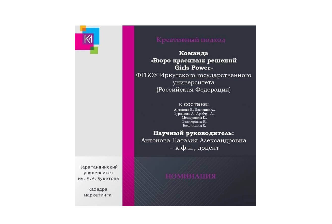 15 — 16 апреля 2021 года на кафедре маркетинга Института исследований цифровой экономики Карагандинского университета имени академика Е.А. Букетова (Казахстан) состоялась II Международная дистанционная олимпиада по специальности «Маркетинг». В ней участвовало 25 команд, 71 участник из 3 стран Ближнего Зарубежья.