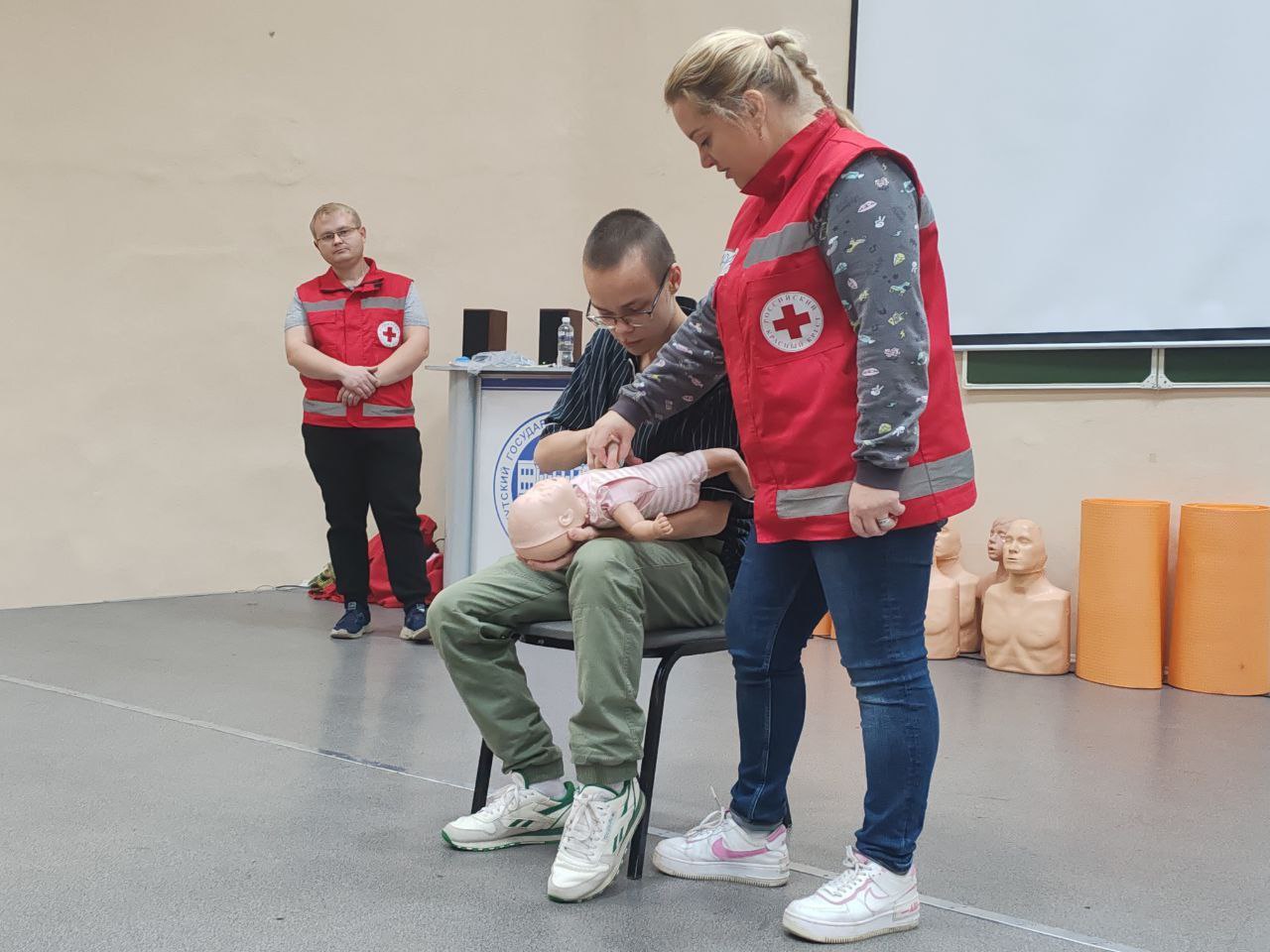 Мастер-классы по оказанию первой доврачебной помощи для первокурсников ФБКИ ИГУ провели инструкторы Иркутского областного отделения Российского Красного креста Марина Ивановна Коломанова и Руслан Абдикахарович Мамбеков. Они рассказали об алгоритме оказания помощи во многих ситуациях.
