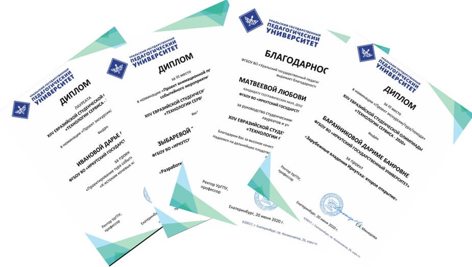 Итоги проведения олимпиады стали известны уже в летние каникулы. Были награждены: Дарима Баранникова, студентка 3 курса (Диплом III степени за проект «Зарубежные владения Иркутска: второе открытие» в номинации «Проект экскурсии»); Эльвира Зыбарева, студентка-выпускница заочной формы обучения (Диплом III степени за проект «Разработка анимационной программы для детского оздоровительного лагеря» в номинации «Проект анимационной программы»); Дарья Иванова, студентка-выпускница очной формы обучения (Диплом лауреата за проектирование тура событийной направленности «К истокам кочевых народов Востока» в номинации «Проект событийного мероприятия») и преподаватель кафедры туризма Любовь Федоровна Матвеева – за организацию участия студентов в олимпиаде и высокое качество подготовки студентов. По первому проекту была проведена апробация экскурсии и онлайн- викторины для экскурсантов со студенческой и школьной российскими группами, два последних проекта были успешно апробированы в июне 2019 года.