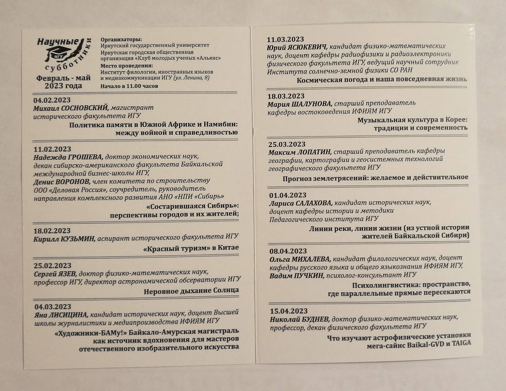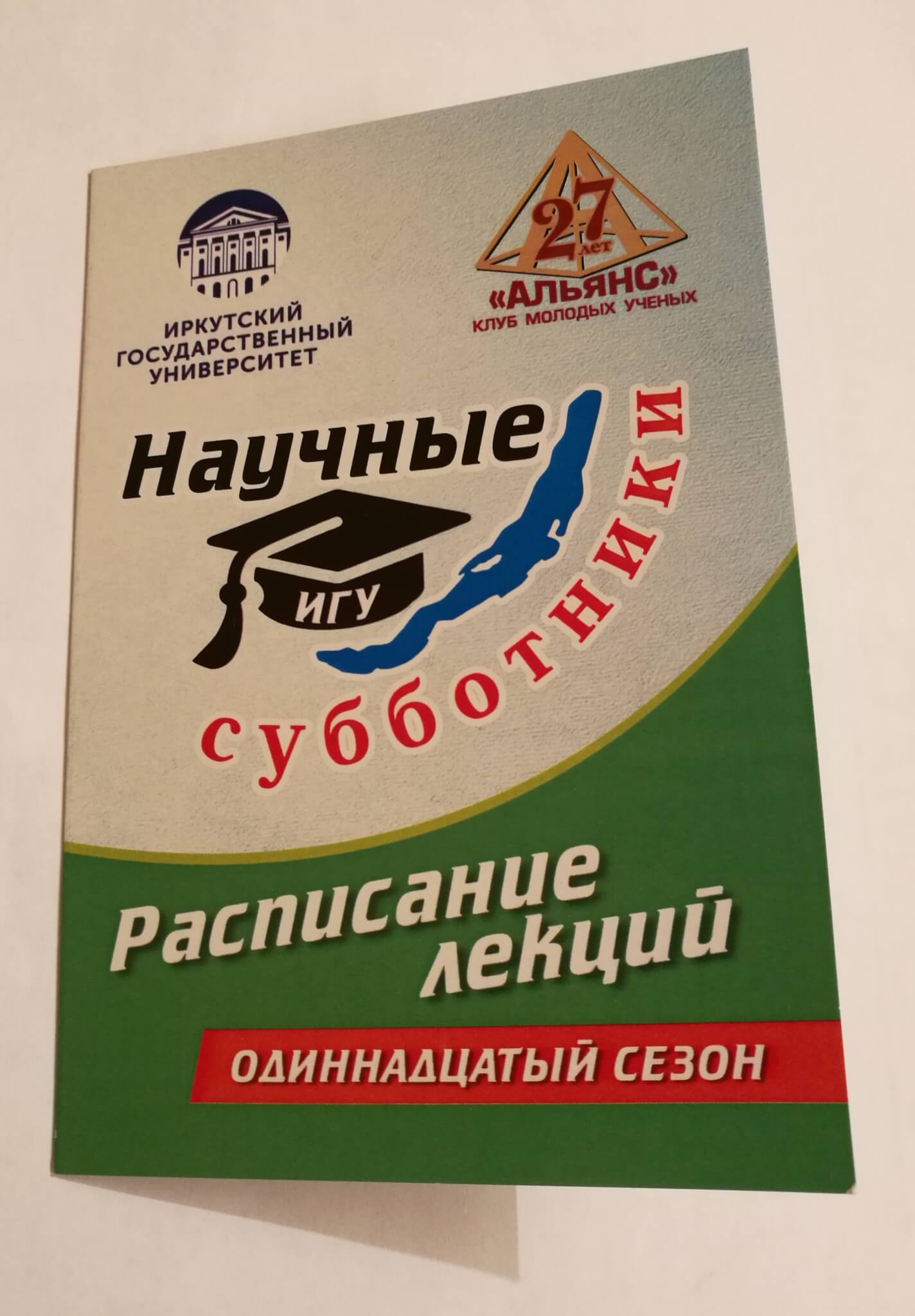 Вконтакте.В 2023 году начался уже одиннадцатый сезон этого проекта. Запланировано 15 лекций, темы которых самые разнообразные: влияет ли космическая погода на нашу повседневную жизнь, прогноз землетрясений, итоги переписи населения и демографические перспективы России, музыкальная культура Кореи, политика в Южной Африке и Намибии, психолингвистика, влияние строительства Байкало-Амурской магистрали на мастеров отечественного изобразительного искусства, перспективы сибирских городов, как выглядит Байкал из космоса, какие кустарники нужны для озеленения Иркутска, где пересекаются параллельные прямые и что такое «красный туризм» в Китае. В этом году проект поменял название и место проведения, но суть проекта осталась неизменной. Это возможность отвлечься от повседневных дел и узнать много нового за субботнее утро, причем совершенно бесплатно; это интересные темы, которые лекторы подают с точки зрения науки, но популярно и доходчиво; живые непосредственные обсуждения рассказанного со слушателями; свободный вход для всех желающих; онлайн-трансляция лекций на платформе RUTUBE и Вконтакте, а также размещение записей лекций на странице научно-популярного блога ИГУ