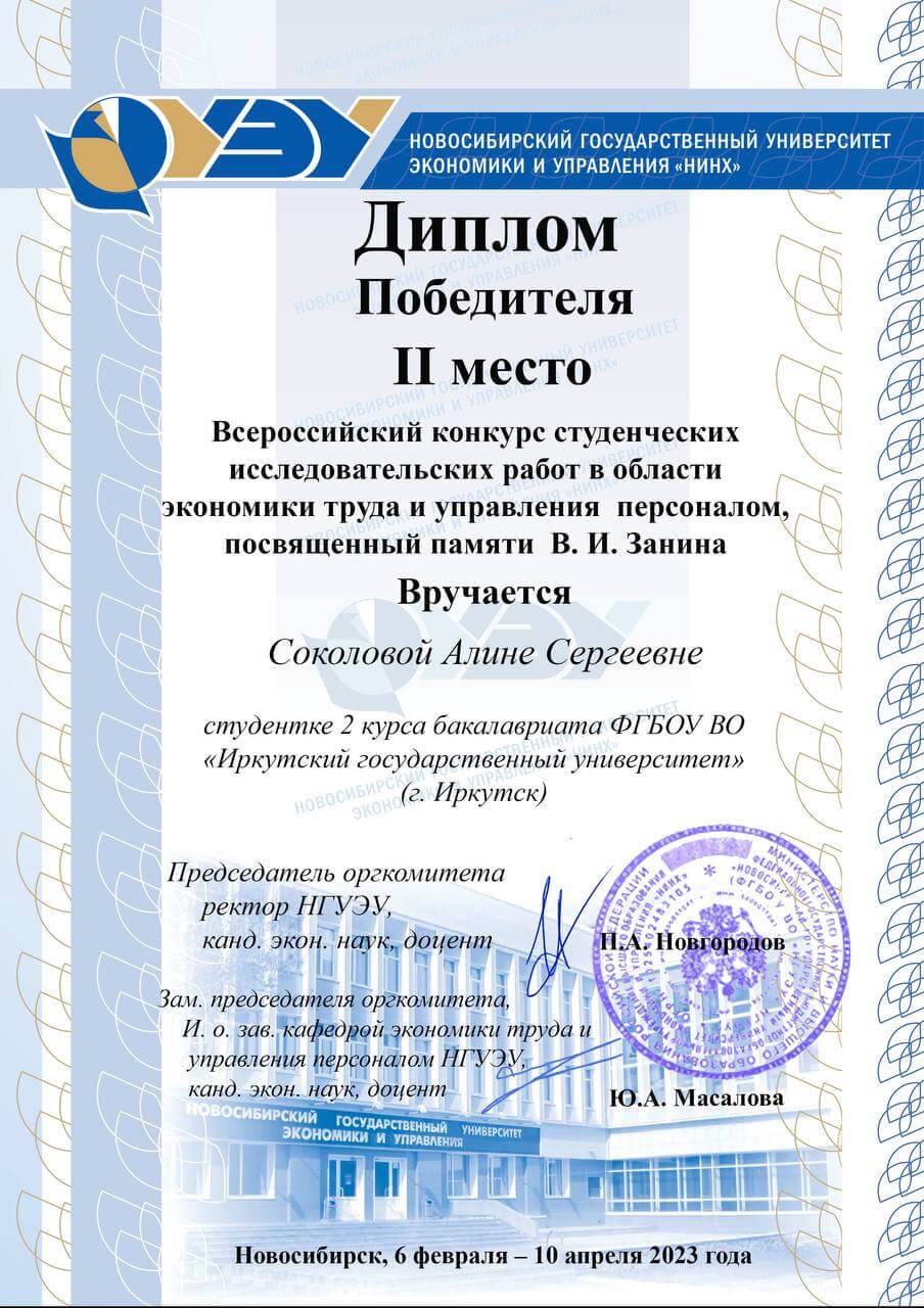 27 апреля в Новосибирске прошла студенческая научно-практическая конференция — Занинские чтения «Управление человеческими ресурсами в условиях BANI-мира"*. Конференция стала завершающим этапом Всероссийского конкурса студенческих исследовательских работ в области экономики труда и управления персоналом, посвященный памяти В. И. Занина. Студентки нашего факультета Людмила Даргеева, Алина Соколова и Алена Жевага заняли I, II и III места соответственно. Конкурс проходил в рамках XVI Сибирского кадрового форума, который в течение многих лет проводит Новосибирский государственный университет экономики и управления «НИНХ». Мероприятие проходило в два этапа: сначала работы участников отправлялись на конкурс заочно, где их оценивала комиссия, далее, по результатам конкурса, участников приглашали на очный этап — конференцию. На конкурсе участники должны были формулировать предложения по выстраиванию эффективной экономики труда и управлению персоналом, использовать все знания теории и практики в сфере управления персоналом, а также владеть большим количеством материала по актуальной проблематике. Людмила Даргеева учится на 4 курсе направления «Управление персоналом». Студентка представила доклад на тему «Проблемы мотивации персонала в условиях удаленной работы» и заняла I место на конкурсе в секции «Мотивация труда и вовлеченность». Как победитель секции, Людмила получила приглашение на конференцию и выступила на Занинских чтениях. Людмила рассказала об участии в конкурсе: