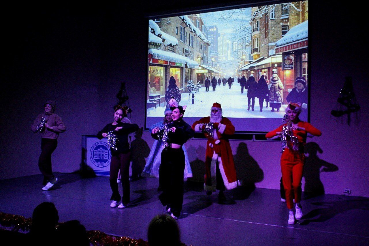 В этом году наши талантливые студенты подготовили праздничную программу под названием "Новогодний переполох". Перед началом действия зрители приняли участие в интерактиве: рисовали ёлку, Деда Мороза, писали пожелания и получали в награду мандарины.