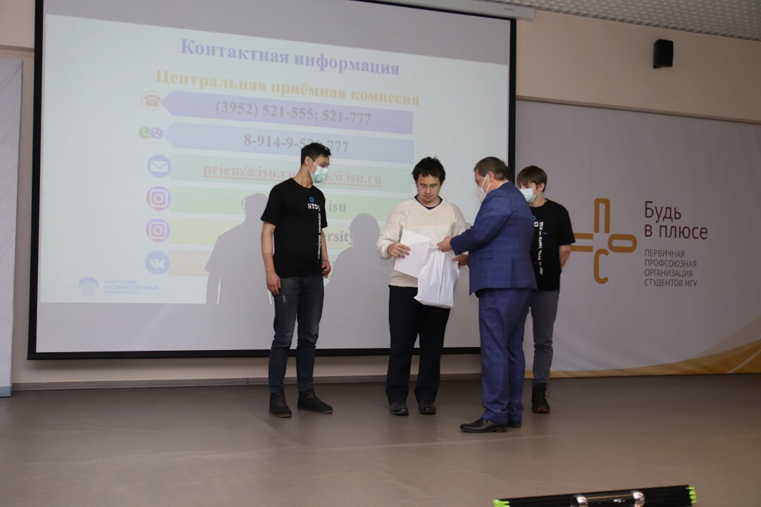 26 марта ректор ИГУ Александр Фёдорович Шмидт вручил дипломы и подарки одиннадцатиклассникам иркутского лицея № 2 Ярославу Степанову, Ивану Жовтому и Георгию Воловикову — призерам Национальной технологической олимпиады по профилю «Технологии виртуальной и дополненной реальности: дополненная реальность». Награждение состоялось в Научной библиотеке им. В. Г. Распутина ИГУ на общеуниверситетском дне открытых дверей.