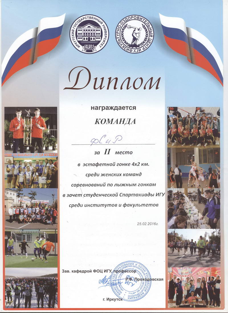 26 февраля на лыжной базе Иркутского государственного университета прошла эстафета среди женских команд по лыжным гонкам в зачет студенческой спартакиады Иркутского государственного университета. В эстафете приняли участие около 8 институтов и факультетов. Команда факультета сервиса и рекламы заняла почетное 2 место. Мы поздравляем участниц команды: Зорину Галину (прикладная информатика, 2 курс); Пляскину Марию (прикладная информатика, 1 курс); Грибович Ирину (туризм, 1 курс); Кружевец Марину (реклама и связи с общественностью, 1 курс).