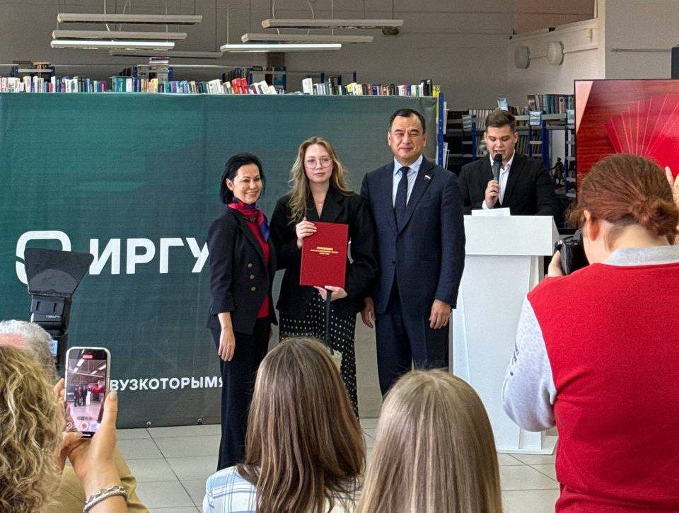 Всего стипендиатами стали 20 студентов вузов Приангарья, в том числе 6 представителей ИГУ. Награду вручал депутат Госдумы, член Попечительского совета фонда Сергей Тен.