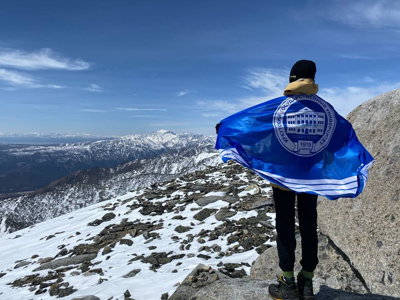 Артем Мещеряков, студент факультета бизнес-коммуникаций и информатики, поднялся в горы с флагом Иркутского государственного университета. Артем учится на 1 курсе направления «Реклама и связи с общественностью». Его самая первая вершина — пик Черского (2090м). Восхождение состоялось в июле 2020 г. Этот подъем был не самый легкий, два дня шёл дождь, было сыро и тяжело. С тех пор трудности стали только привлекать Артема. Ему удалось совершить девять успешных восхождений из двенадцати, шесть совершены под его руководством. С момента первого похода по текущий день он совершил 82 похода, так что его походный стаж составляет 1 год и 10 месяцев 677дней. С флагом ИГУ Артем поднялся на две вершины: пик Хулугайша (3015 м) и на Мунку-Сардык (3491 м), наивысшую точку Саянских гор. На Пик Хулугайша Артем поднялся за 1 день, он прошёл 35 км. Набор высоты составил 2361 вертикальный метр (для сравнения — это как подняться на 787 этаж), общее время в пути 14,5 ч и 660 км на машине. Для Мунку-Сардык эти показатели составили: 700 км на машине, 30,6 км и 15,5 ч ходьбы, 2123 м набора высоты. На сегодняшний день для Артема Мунку-Сардык является самой высокой горой, на которой он был. Мунку-Сардык — самая высокая вершина Саян, находится в Бурятии на границе России и Монголии. Артем Мещеряков рассказал, почему именно горы стали его выбором и что его влечет к ним: