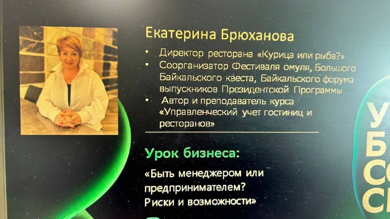 Занятие провела директор ресторана «Курица или рыба?», соорганизатор Фестиваля омуля, Большого Байкальского квеста и Байкальского форума выпускников Президентской Программы, автор и преподаватель курса «Управленческий учëт гостиниц и ресторанов» Екатерина Брюханова