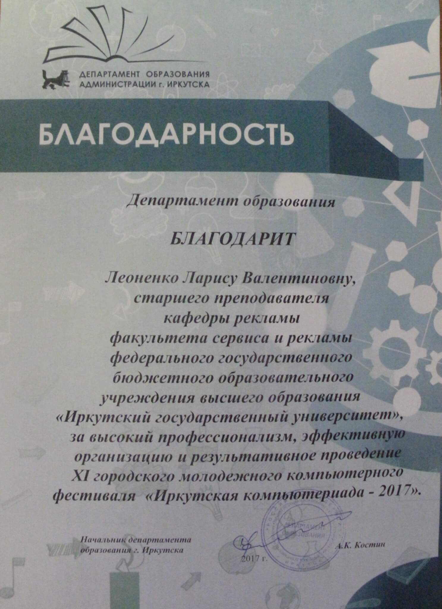 3 Мая в Доме учителя прошло заседание круглого стола по результатам проведения Иркутской компьютериады- 2017. Организаторами круглого стола выступил Департамент образования г. Иркутска. Напомним, что факультет сервиса и рекламы ИГУ ранее выступил организатором 3-х мероприятий, проведенных в рамках Иркутской компьютериады — 2017: Хакатон или «Марафон разработчиков», Конкурс детской авторской анимации и Конкурс-игру «Интеллектуальная энергетика». http://sr.isu.ru/news/fakultet-servisa-i-reklamyi-vyistupil-organizatorom-kosmicheskih-meropriyatiy. На заседании присутствовали организаторы фестиваля: лицей № 1, представители ведущих ВУЗов Иркутска: ИГУ, ИрНИТУ, БГУ, а также преподаватели школ и лицеев города Иркутска. Факультет сервиса и рекламы ИГУ представляли заведующая кафедрой естественно-научных дисциплин, доцент Балахчи А. Г, старшие преподаватели кафедры естественно-научных дисциплин Веснин А. М, Петрушин И.С., старший преподаватель кафедры рекламы Леоненко Л.В. Начальник Департамента образования г. Иркутска А. К. Костин выразил благодарность факультету сервиса и рекламы ИГУ и лично заведующему кафедрой естественно-научных дисциплин А.Г. Балахчи, старшим преподавателям кафедры естественно-научных дисциплин И. С Петрушину и А. М Веснину, а также старшему преподавателю кафедры рекламы Леоненко Л. В за высокий профессионализм, эффективную организацию и результативное проведение 11 городского молодежного компьютерного фестиваля «Иркутская компьютериада — 2017». На совещании также рассматривались вопросы популяризации компьютерных технологий, перспективы партнерства в сфере развития компьютерных технологий между ВУЗами города Иркутска, а также вопросы дальнейшего развития фестиваля.