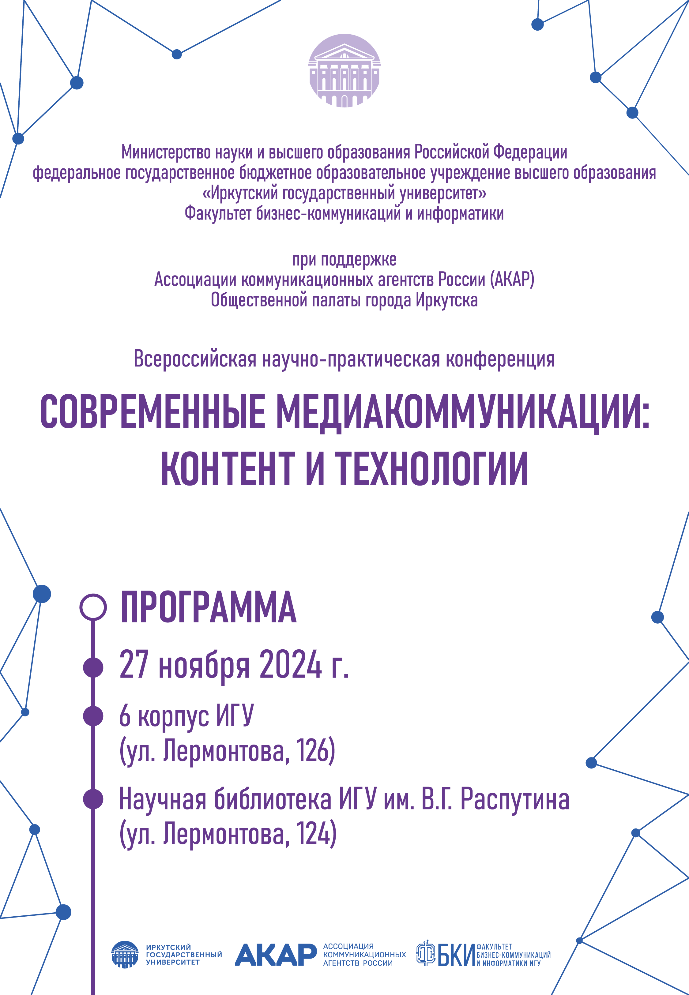 27 сентября 2024 г. в Иркутском государственном университете на факультете бизнес-коммуникаций и информатики состоится Всероссийская научно-практическая конференция «СОВРЕМЕННЫЕ МЕДИАКОММУНИКАЦИИ: КОНТЕНТ И ТЕХНОЛОГИИ».