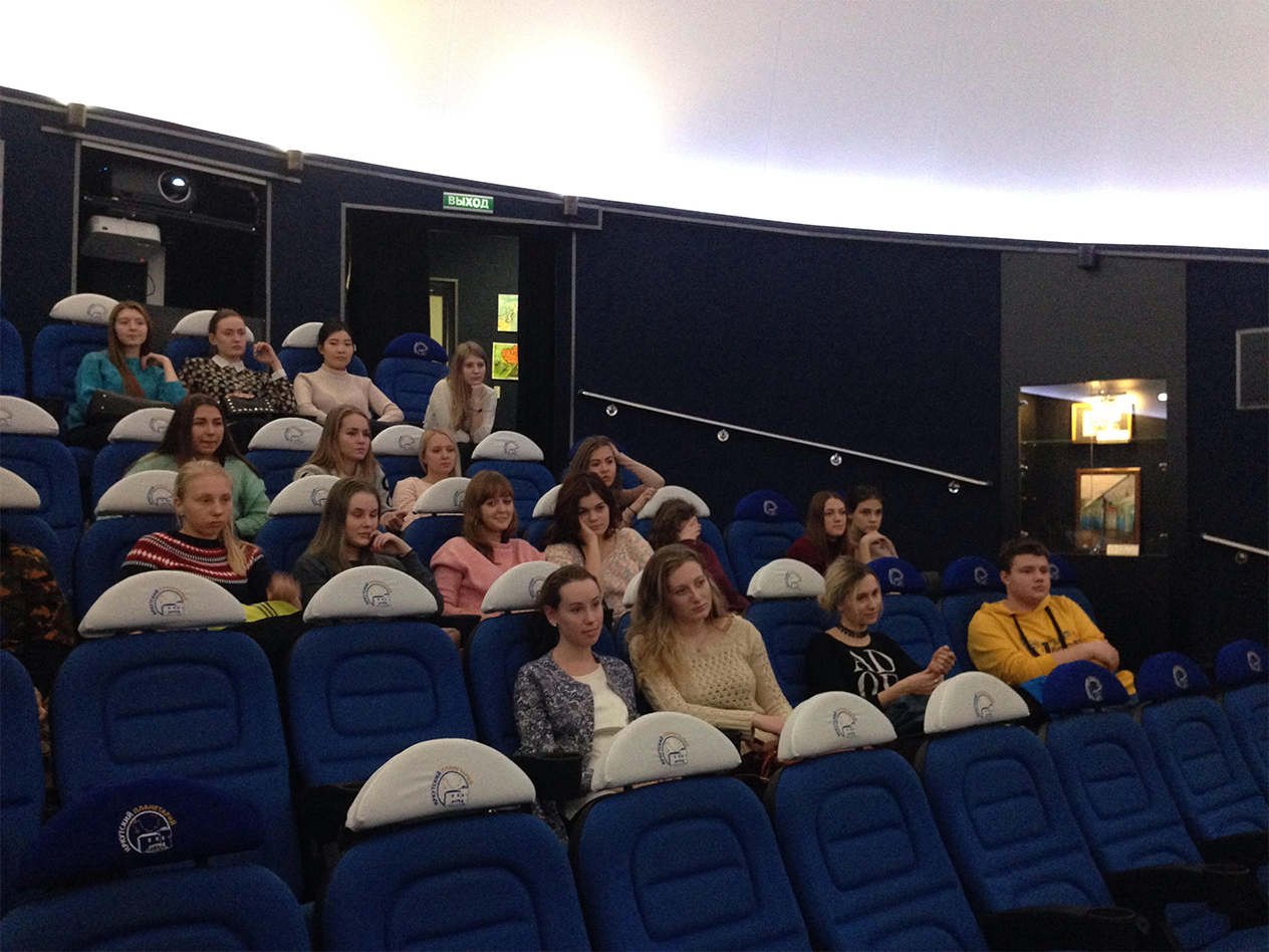 Пресс-секретарь музея «Ноосфера» Евгения Скареднева рассказала об экспонатах музея. Будущим специалистам в области рекламы и PR-технологий были представлены методы продвижения музея с помощью организации специальных мероприятий, среди которых выездные ночные наблюдения звездного неба, различные городские акции. Кроме этого, для популяризации астрономических знаний используются площадки в социальных сетях, в настоящий момент очень активно растет группа «ВКонтакте». Студенты узнали, что прямую рекламу музей «Ноосфера» практически не использует. Мультимедийный музей, астрономическая обсерватория и планетарий на 45 мест работают как единый комплекс, созданный при помощи ГК «Метрополь». В качестве подарка от планетария студентам был показан полнокупольный фильм «Энергия Вселенной» о научных космических наблюдениях современных обсерваторий. Премьера фильма состоялась несколько дней назад — 2 декабря в «Ноосфере», во время нее была установлена видеосвязь с молодым режиссером фильма - Теофанисом Матсопулосом (Греция). По словам студентов факультета сервиса и рекламы, визуальные эффекты, музыкальное сопровождение в фильме, полусферический экран произвели на них сильное впечатление. Это одновременно современная форма передачи высокоточных научных знаний о космосе и незабываемое 3D-шоу. Занятие было полезным еще и потому, что традиционная Летняя школа компьютерных и коммуникационных технологий следующим летом планируется на тему космоса и будет связана как раз с созданием полнокупольных фильмов.