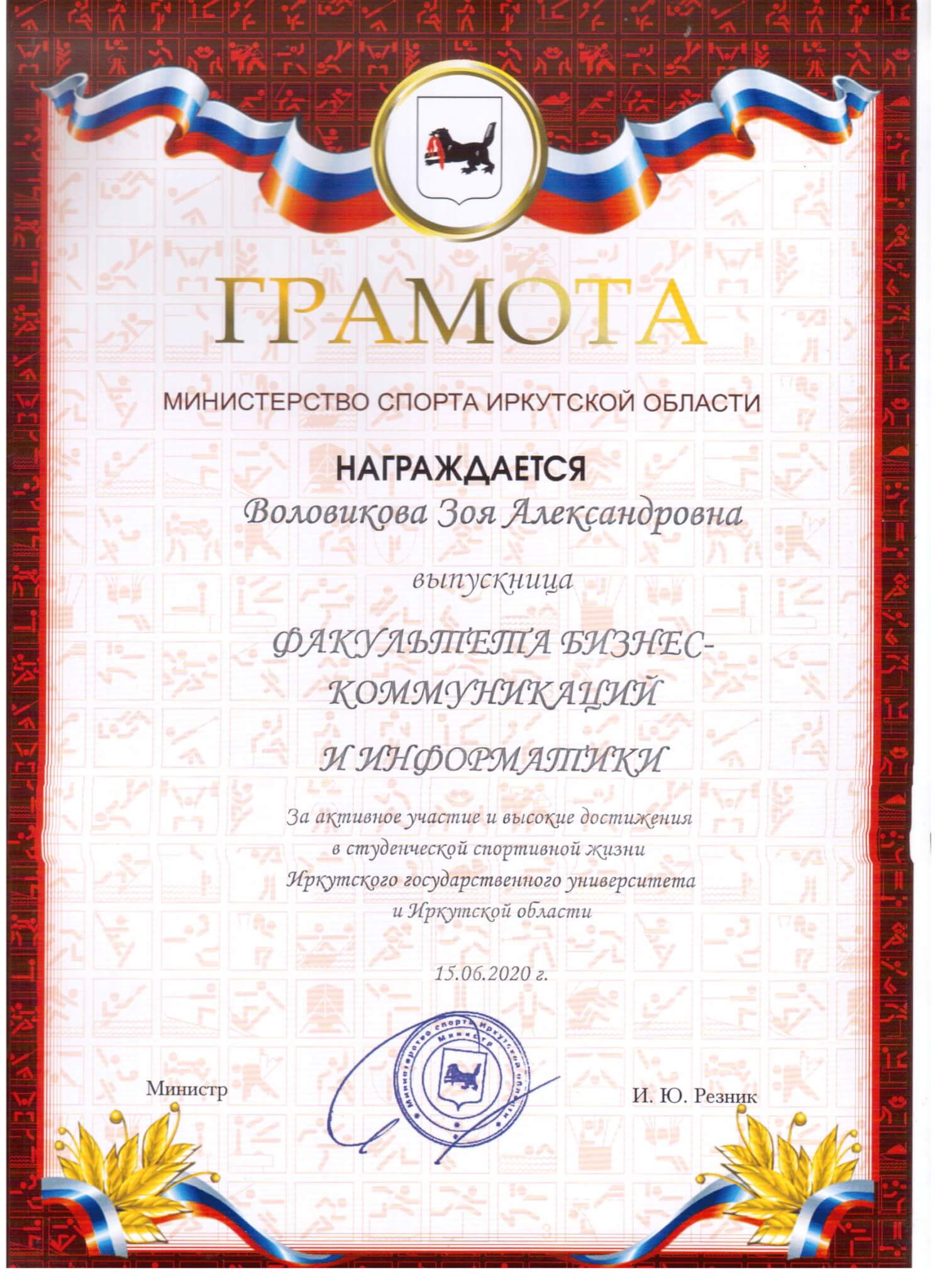 Министерство спорта Иркутской области отметило спортивные заслуги выпускников факультета бизнес-коммуникаций и информатики. Грамотами за активное участие и высокие достижения в студенческой спортивной жизни ИГУ и Иркутской области за подписью министра И. Ю. Резника награждены Анастасия Рыкова, Евгений Егоров, Мария Холомянская, Валентина Ленская и Зоя Воловикова. Мы не раз писали об их достижениях. Поздравляем наших выпускников и желаем успехов на жизненном пути, в профессиональной деятельности и во всех начинаниях.