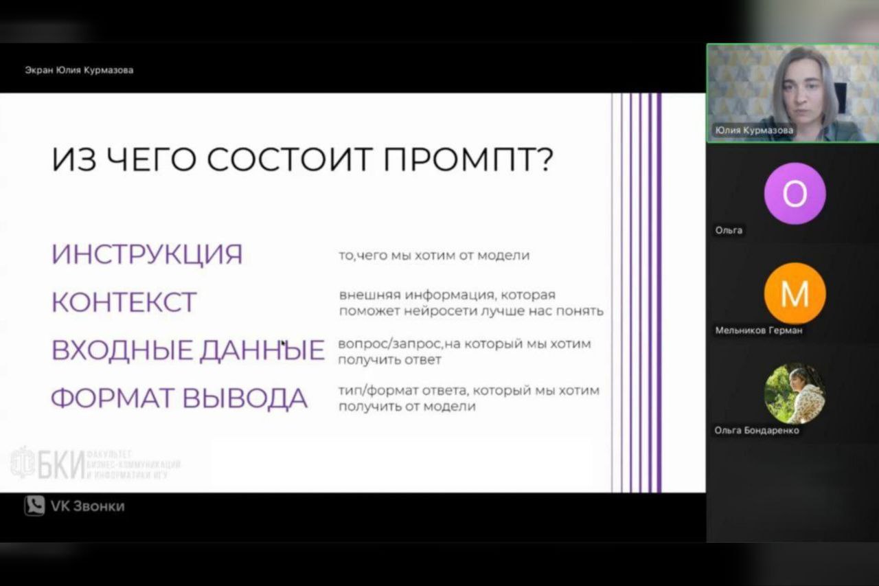 Занятия по использованию нейронных сетей провела для учеников 8-11 классов Иркутска и Иркутской области старший преподаватель кафедры естественнонаучных дисциплин, заместитель декана ФБКИ ИГУ по учебной работе Юлия Евгеньевна Курмазова.