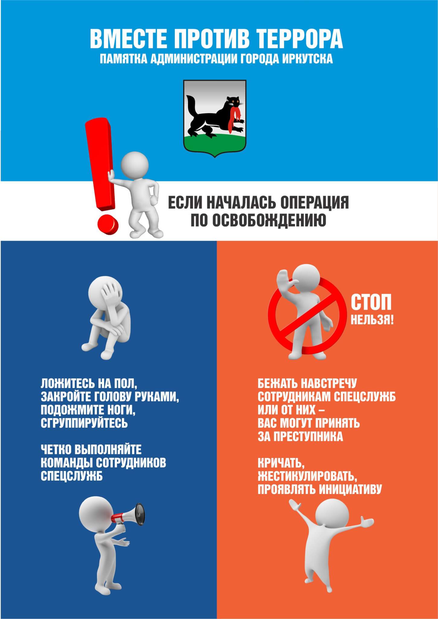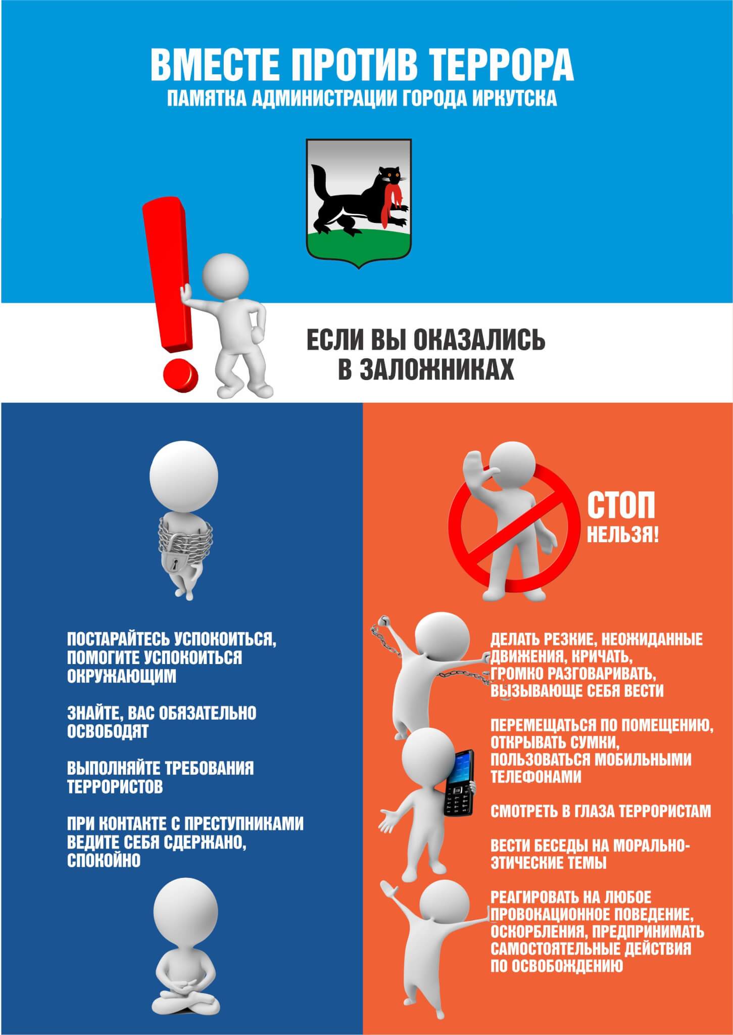— при необходимости выполнять требования преступников, если это не связано с причинением ущерба жизни и здоровью людей. Не противоречить преступникам, не рисковать жизнью окружающих и своей собственной; инициативно не вступать в переговоры с террористами;