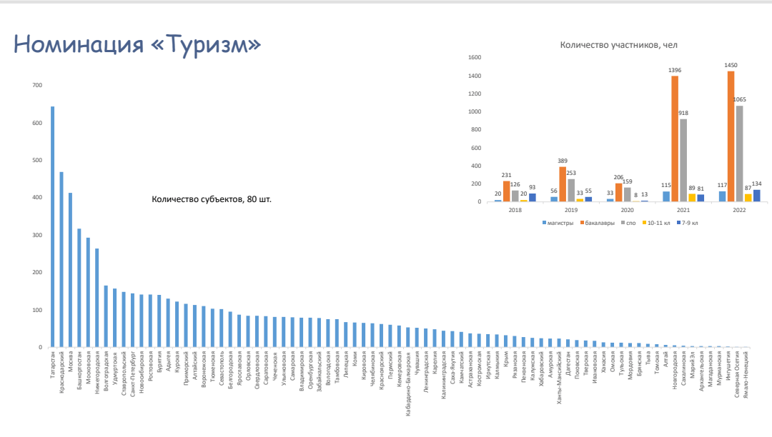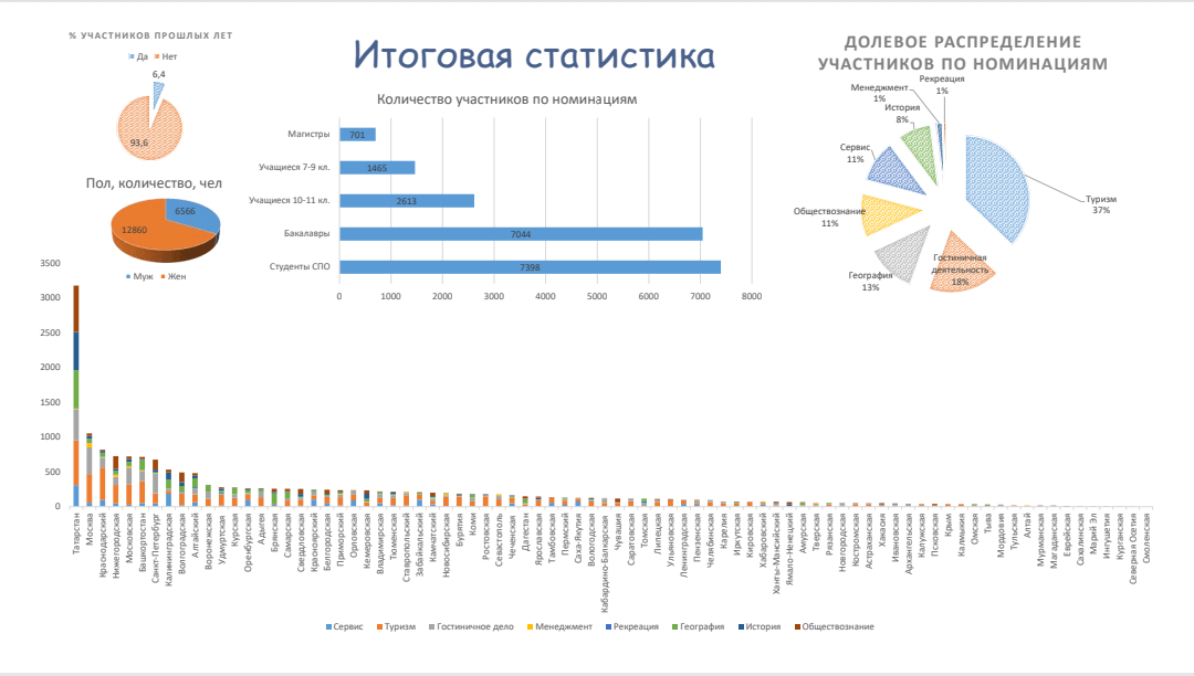 В этом году число участников выросло. В отборочном этапе олимпиады приняли участие 7700 человек из 82 регионов РФ и зарубежные участники из многих стран (Казахстан, Армения, Гана, Азербайджан, Сирия, Киргизия, Вьетнам, Йемен, Узбекистан, Таджикистан, Ангола, Ливан, Египет, Судан, Китай, Белоруссия, Туркменистан, Латвия, Иордания, Кения, Абхазия, Дания, Монголия, Эфиопия и Венгрия). В заключительном этапе очно состязались 1037 участников. Всего в номинации «Туризм» (бакалавриат) состязались 1450 участников; больше всего участников было из Татарстана, Краснодарского края, Москвы и Московской области, Башкортостана и Новгородской области. В число абсолютных победителей с максимальным количеством 100 баллов вошли 6 студентов-бакалавров из Рязани, Саратова, Ижевска, Владивостока, Москвы и Иркутска. Среди этих победителей — наша Маргарита Поднебесова.
