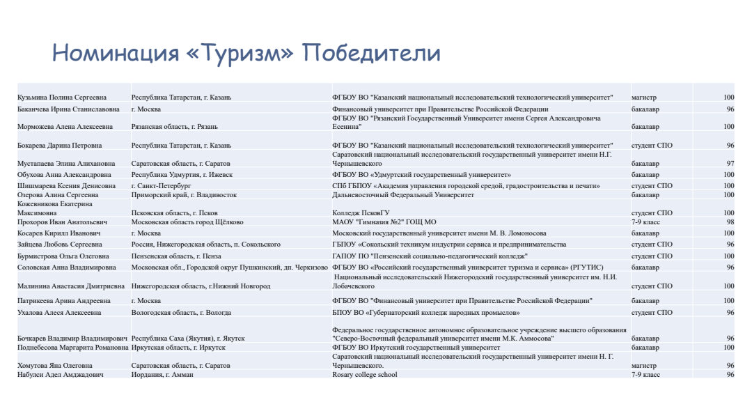 Хочется подчеркнуть, что участие студентов и преподавателей в таких профильных федеральных и региональных конкурсах и олимпиадах является чрезвычайно важным и стимулирующим фактором совершенствования системы подготовки кадров для туристической отрасли России.