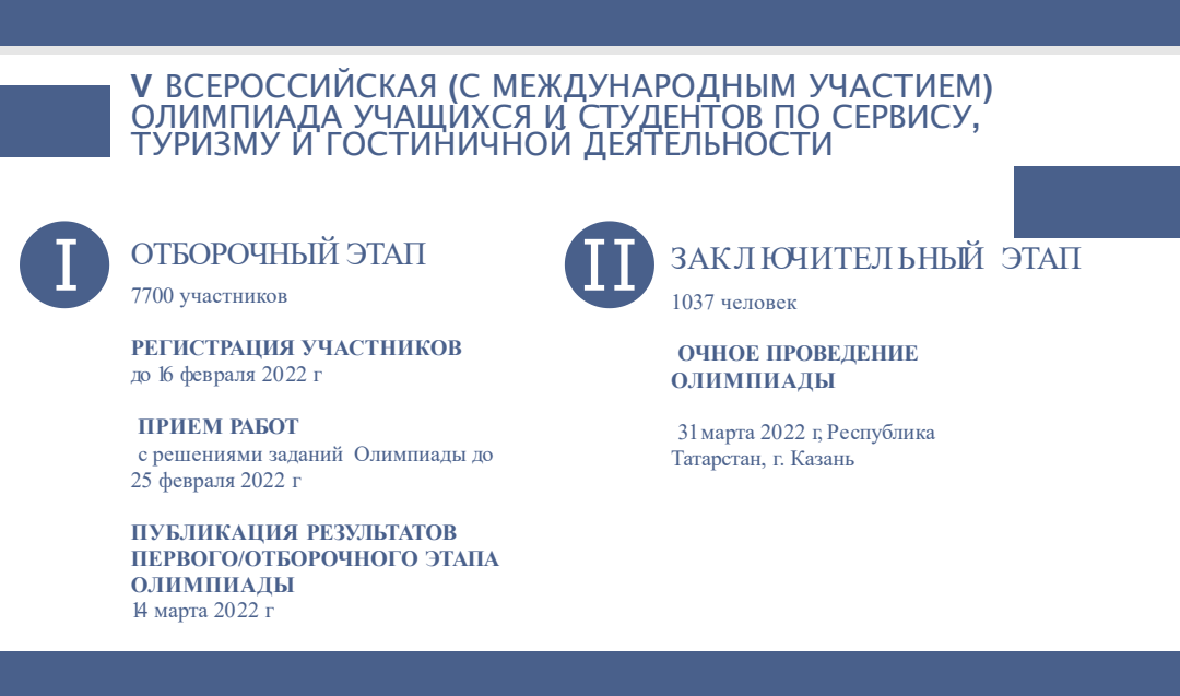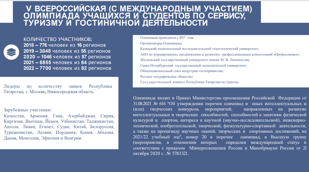 Справка. Олимпиада проводится по направлениям «Сервис и туризм», «Менеджмент в туристской и гостиничной индустрии», «Рекреация и спортивно-оздоровительный туризм» и др. Организаторами проекта выступают Федеральное агентство по туризму, Российский союз туриндустрии, Общенациональный союз индустрии гостеприимства, Русское географическое общество, АНО по формированию, продвижению и развитию профессиональных компетенций «Профессионал», Государственный Комитет Республики Татарстан по туризму и более 80 других образовательных учреждений России. Олимпиада входит в Высшую группу приказа Министерства просвещения Российской Федерации от 31.08.2021 № 616 перечня олимпиад и иных интеллектуальных и (или) творческих конкурсов на 2021/22 учебный год.
