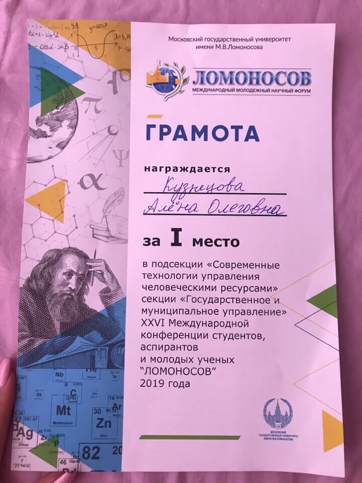 Студентка факультета сервиса и рекламы Алёна Кузнецова заняла 1 место на XXVI международной конференции студентов, аспирантов и молодых учёных «ЛОМОНОСОВ», которая проходила в Москве в МГУ имени М. В. Ломоносова. Эта масштабная конференция объединила около 12 тысяч участников из 55 регионов и 7 стран. Заседание секции «Государственное муниципальное управление», где выступала наша студентка, длилось целых 5 часов. Доклад Алёны Кузнецовой назывался «Совершенствование системы обучения персонала в некоммерческой организации», и был посвящен переработанной и усовершенствованной системе обучения. Нововведения автора помогают решить ряд выявленных проблем. Разработки будут рекомендованы к внедрению в процесс обучения в нашем университете. Алена учится на 4 курсе направления «Управление персоналом», активно занимается общественной деятельностью, руководит профбюро факультета сервиса и рекламы и уже не первый раз получает заслуженные награды. Поздравляем Алёну с победой и желаем новых успехов!