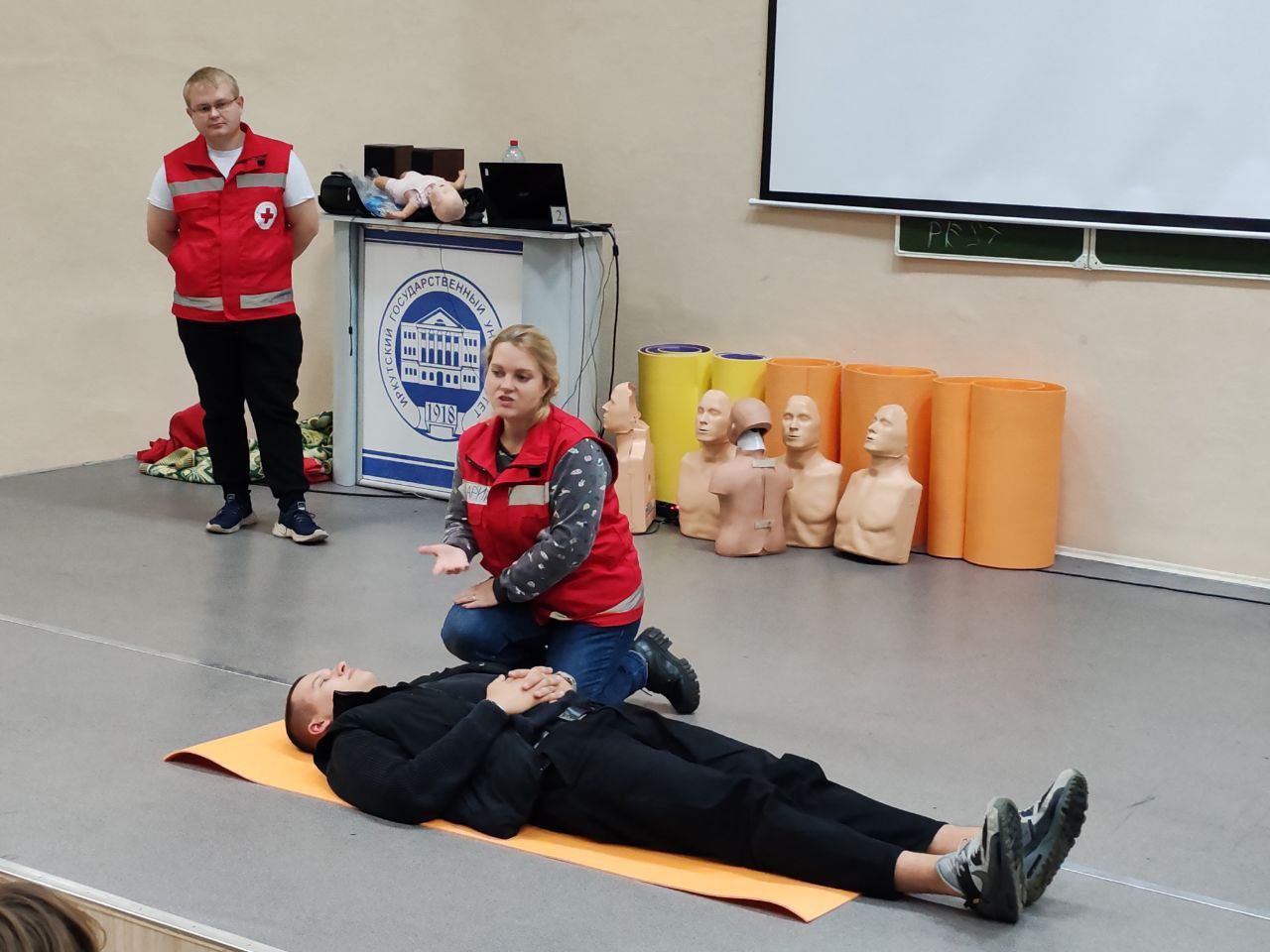 Мастер-классы по оказанию первой доврачебной помощи для первокурсников ФБКИ ИГУ провели инструкторы Иркутского областного отделения Российского Красного креста Марина Ивановна Коломанова и Руслан Абдикахарович Мамбеков. Они рассказали об алгоритме оказания помощи во многих ситуациях.