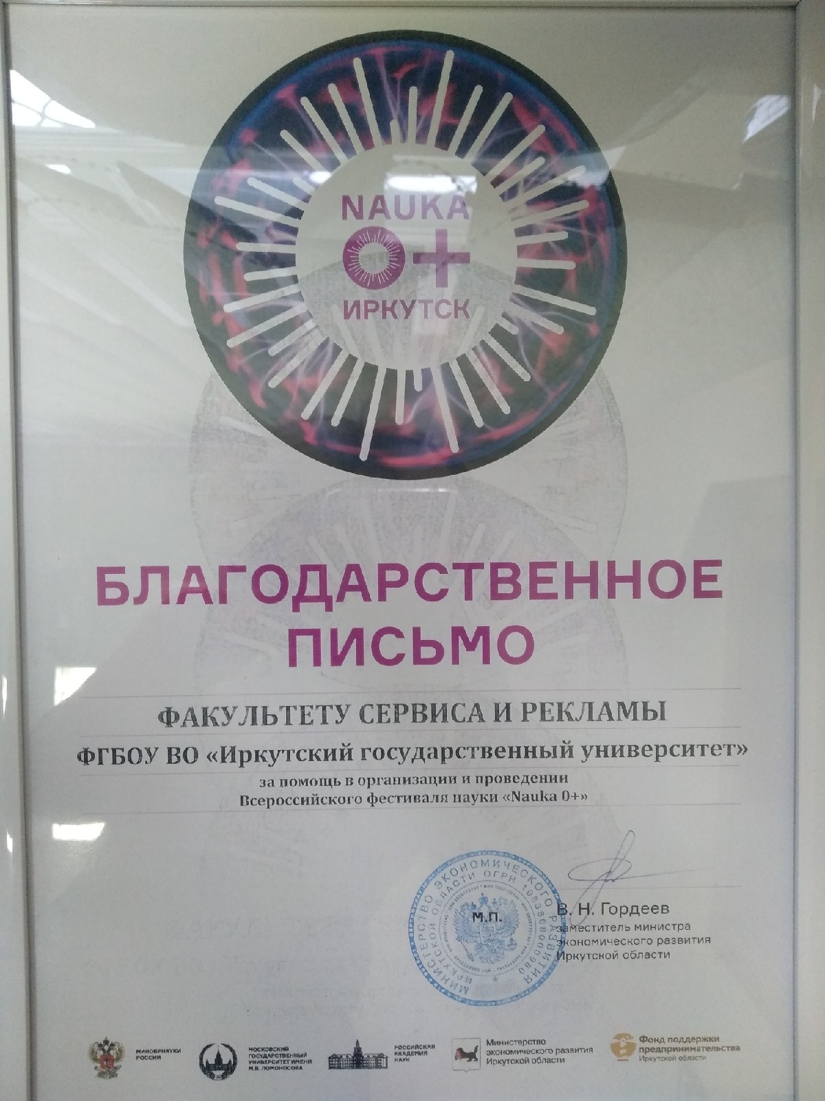 Факультету сервиса и рекламы вручено благодарственное письмо от Министерства экономического развития Иркутской области за помощь в организации и проведении Всероссийского фестиваля «Nauka 0+». Ежегодное мероприятие всероссийского масштаба проходило с 22 по 23 ноября в Научной библиотеке ИГУ им В. Г. Распутина. Его соорганизатором стало Министерство экономического развития Иркутской области. Факультет сервиса и рекламы традиционно отвечал за значительную часть мероприятий программы. Центр начального инженерного образования «МИКРОН» факультета сервиса и рекламы организовал работу мастерских по таким интересным темам как «Умные вещи», «Мобильные роботы», «Автоматизация работы группы в социальных сетях», «Разработка приложений для мобильных устройств» и др. Также факультет сервиса и рекламы и Центр инновационного молодежного творчества «STEM-Байкал»" презентовали зрителям фестиваля первую инженерную «Олимпиаду НТИ» и ежегодную научно-практическую конференцию «Удивительный мир». Кроме того, для посетителей была организована интерактивная фотозона. В рамках фестиваля факультет провел Межрегиональную молодежную научно-практическую конференцию «Развитие туризма и рекреации в Байкальском регионе». Фестиваль «Наука 0+» рассчитан на широкую аудиторию. Его цель — просто и понятно рассказать обществу, что делают ученые, как научные исследования помогают человеку и улучшают его жизнь, какое будущее ждёт современного человека. Это событие привлекает много молодежи, большое количество школьников, которые приходят вместе со своими родителями. Здесь ребята могут реализовать и раскрыть свой потенциал, ведь это своеобразный день открытых дверей в науку. Фестиваль «Наука 0+» демонстрирует молодым людям перспективы в этой сфере и способствует формированию их интересов.