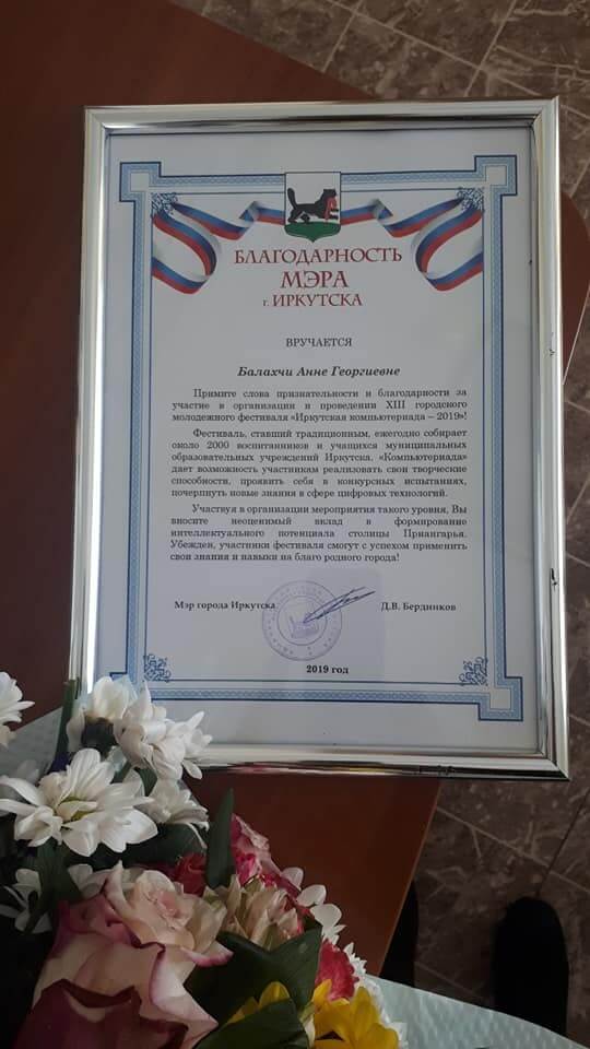 1 февраля СКДЦ «Художественный» состоялось торжественное закрытие XIII городского молодёжного фестиваля «Иркутская компьютериада — 2019». Первый проректор ИГУ Александр Шмидт вручил дипломы победителям и призерам конкурсов. Мэр г. Иркутска Дмитрий Бердников вручил благодарность и. о. ректора ИГУ Игорю Бычкову за участие университета в организации и проведении значимого для города мероприятия. Также благодарность мэра получила заведующая кафедрой естественнонаучных дисциплин факультета сервиса и рекламы Анна Балахчи. Посмотреть видеосюжет о мероприятии можно в 12 выпуске информационной передачи «Всё ФСиРьёз» по ссылке.