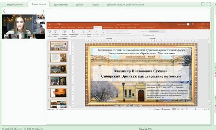 Работа конференции была организована в двух форматах: очно и в форме конференц-связи. Наши студенты представили исследования, оформленные в виде статей, относящиеся к блокам «Краеведение. Мои земляки», «Географическое краеведение», «Туризм и туристско-рекреационные ресурсы России и зарубежья». На онлайн-конференции были представлены доклады: «Владимир Платонович Сукачев: Сибирский Эрмитаж как завещание потомкам» (Алиса Ильина), «Оставив след в истории Иркутска» (Александра Крижевец), «Особенности городской архитектурно-пространственной среды города Ангарска как экскурсионно-туристский ресурс» (Юлия Алкина).