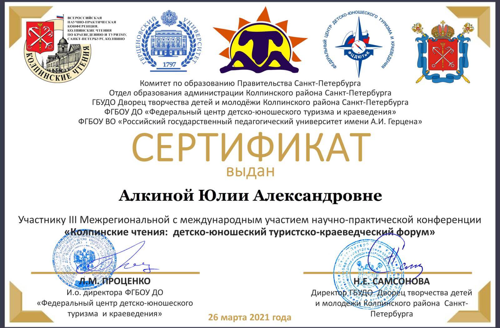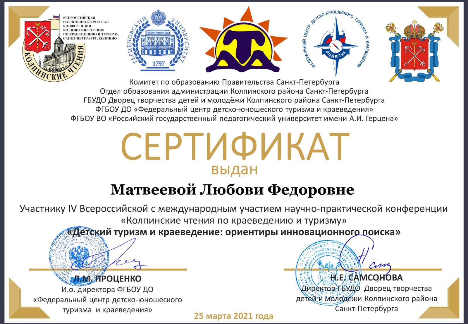 26 марта 2021 года студенты факультета бизнес-коммуникаций и информатики Алиса Ильина, Юлия Алкина и Александра Крижевец под руководством Любови Федоровны Матвеевой, к.г.н., доцента кафедры туризма, приняли участие в III Межрегиональной с международным участием научно-практической конференции «Колпинские чтения: детско-юношеский туристско-краеведческий форум». Конференция готовилась совместно с РГПУ имени А.И. Герцена г. Санкт-Петербурга, Русским географическим обществом и другими социальными партнёрами при информационной поддержке научно-методического журнала «География и экология в школе XXI века». Цель конференции — повышение значимости краеведческих исследований и туристско-краеведческой деятельности как средства патриотического воспитания подрастающего поколения. Направления работы конференции, которая проходила 25−26 марта, обширны и актуальны, включают много блоков: теорию и практику туристско-краеведческой деятельности в образовательных учреждениях; вопросы патриотического воспитания учащихся в детско-юношеском туризме и краеведении; деятельность краеведческих музеев (история создания, функции, образовательные программы и методы их реализации); туристско-рекреационный потенциал регионов России и других стран и его использование в детско-юношеском туризме; краеведческие исследования в походах и экспедициях со школьниками и студентами; этнопедагогика и этнический туризм; история краеведения и детского туризма. Целевую аудиторию конференции составляют сотрудники учреждений основного, дополнительного, высшего и среднего профессионального образования России и стран СНГ; учащиеся и студенты; музейные работники, занимающиеся туристско-краеведческой деятельностью со школьниками и студентами. Руководитель исследовательских работ Любовь Федоровна Матвеева рассказала: