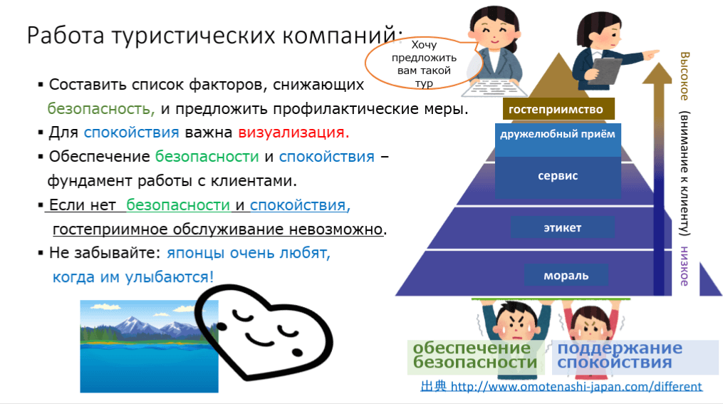 Г-н Миямото Тадаси подчеркнул главное во взгляде японцев на путешествия: избегание рисков, устранение тревожности, подготовка к туру и проверка информации, а затем визуализация впечатлений. Например, Владивосток — очень привлекательный для японцев и самый доступный «европейский» город, не похожий на азиатский мир, он находится в 3-х часовой зоне доступности и может использоваться для поездки на выходные дни. Японцы издавна любят русскую культуру: музыку, литературу, театр, балет. Но о чём беспокоятся японцы, когда хотят посетить Россию? С точки зрения японца, в России достаточно сухой воздух. Этот факт обязательно нужно доводить до сведения туристов, т.к. они могут быть не готовы к этому. Многие японцы беспокоятся, что «Россия — холодная страна». Они не знают, как одеваться («в домах тепло, а как одеваться при выходе на улицу?»). Многих интересовало то, «насколько рано здесь темнеет». В кафе и ресторанах «должны быть чек-листы уборки». Русская кухня всегда была очень вкусной, но «раз борщ (как национальное блюдо) красный, то он, наверняка, невыносимо острый». Здесь срабатывает аналогия с китайскими блюдами (красный=перец). Многие россияне, с точки зрения японцев, довольно «статные и полные». Они предполагают, что «еда у россиян жирна и, соответственно, нездорова». Так же многих молодых людей в Японии интересует, «есть ли здесь рестораны быстрого питания (Макдональдс)». Многие японцы думают, что «россияне очень угрюмые люди», а для японцев улыбка значит многое. Беспокоит «незнание русского языка». Нет уверенности, что иностранцу помогут, когда это необходимо. Японцев беспокоит, «какое мнение у русских складывается о японской нации». Тех, кто уже побывал в России, поражает обилие японских автомобилей. Увидев их, многие японцы успокаивались, так как думали, что, если россияне ездят на японских машинах, значит, любят Японию и доверяют ее гражданам. Еще один вопрос, который сильно беспокоит, «помогут ли в России, если нужна будет медицинская помощь». Почему японцы предъявляют такие высокие требования к безопасности? Япония — страна вулканов, цунами и землетрясений. Это опасности природного характера. Безопасность среди социума является как бы компенсатором. Для японцев важно, чтобы не было рисков при путешествии, поэтому следует сделать так, чтобы город или регион, в котором вы живете и приглашаете туда туристов, вызывал ощущение безопасности и спокойствия. Надежда Самохвалова, студентка 1 курса, продолжила рассказ: — В условиях пандемии правительство Японии поддерживает туристическую отрасль. Но туристы всё ещё боятся заразиться коронавирусом. Японцам был задан вопрос: «Какое бы путешествие вы хотели совершить сразу после окончания пандемии?». Их ответ заключался в следующем: 1 место по рейтингу — горячие источники провинциальной Японии (спокойное путешествие за пределами переполненных городов), так же на первом месте желание остановки в хорошем отеле; 2 место — вкусно покушать. Если говорить просто, то работа туристической компании заключается в том, чтобы узнать как можно больше информации, чтобы удовлетворить максимальное количество желаний туриста, даже тех, о которых сам турист не задумывался. Для работника туркомпании важно узнать, что за человек его клиент, т.к. из-за физического и психологического состояния следует скорре