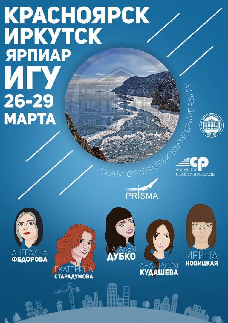 «Коммуникации будущего» — именно так звучала тема 16-го Всероссийского фестиваля по рекламе и связям с общественностью «Ярпиар», который проходил в городе Красноярске с 26 по 29 марта в Сибирском государственном университете науки и технологий им. акад. М.Ф. Решетнева. В этом году фестиваль посетили 20 команд со всех уголков России: Москва, Санкт-Петербург, Кемерово, Якутск, Томск, Екатеринбург и др. Город Иркутск представила команда студенток факультета сервиса и рекламы «BAIKAL PRISMA». В составе команды студенты второго курса: Стародумова Екатерина, Дубко Наталья, Фёдорова Ангелина, Новицкая Ирина и студентка третьего курса Кудашева Анастасия. Руководитель команды — Подкаменная Елизавета Васильевна, доцент кафедры рекламы факультета сервиса и рекламы ИГУ. Подготовка наших студентов к фестивалю началась задолго до его официального открытия. До начала фестиваля участником было необходимо разработать плакат своей команды, снять видеоролик, придумать мем, отражающий свою команду, ответить на вопросы организаторов, написать исследовательскую работу для научно-практической конференции и решить кейсы от 9 партнеров фестиваля, среди которых Администрация Красноярска, «Театр на крыше», «MERСEDES-BENZ», «Ярхлеб», Дом.ru и др. Каждый кейс требовал от ребят огромной вовлеченности в проблему, глубоких знаний в своей профессии и креативного подхода. Оценивали решения кейсов и выявляли победителей сами представители организаций.
