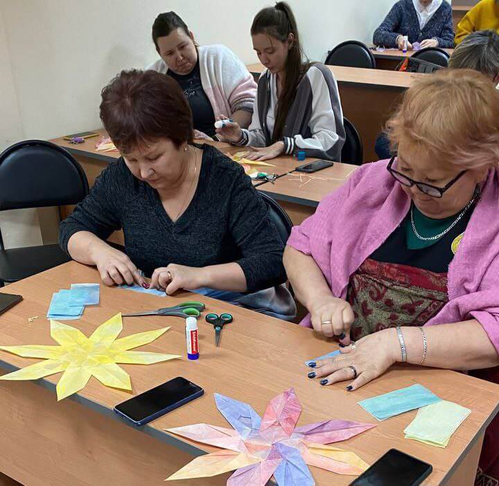 Необычный мастер-класс провели для сотрудников факультета бизнес-коммуникаций и информатики ИГУ молодые архитекторы архбюро REBRO. Преподаватели, сотрудники деканата, заведующие кафедрами и и.о. декана учились делать… новогодние звезды. Теплая атмосфера и совместное творчество позволили всем с удовольствием и азартом погрузиться в процесс. Каждый участник унес домой не только звезды, сделанные своими руками, но и ощущение приближающегося праздника. Смотрите сами, как это красиво! Фото здесь, видео — в соцсетях факультета.