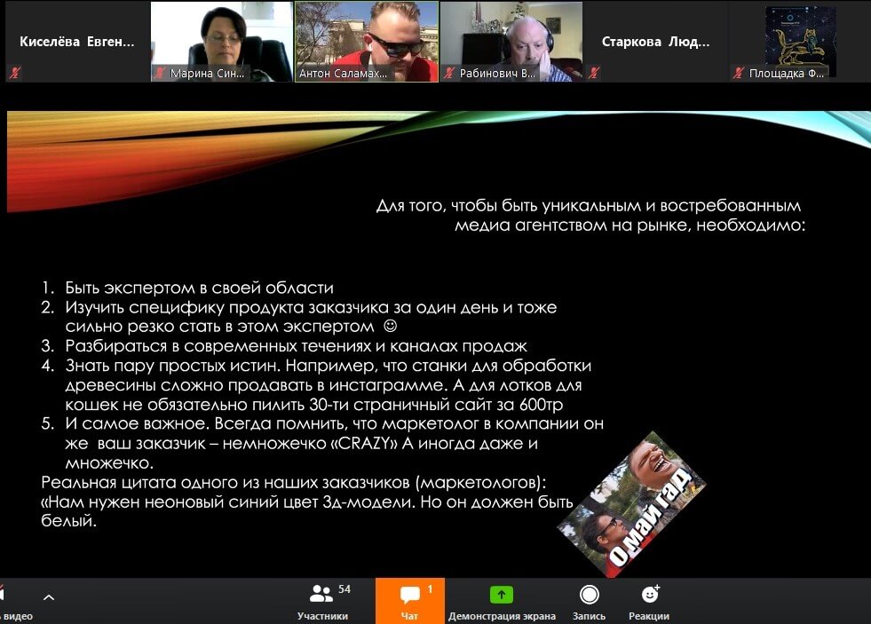 Антон провел эфир на тему, которая сейчас актуальна как никогда: «Адаптация рынка рекламы и маркетинга в эпоху вируса и прочих ограничений». Участники эфира на примерах кейсов, конкурсов и шарад смогли узнать, что нужно сделать маркетологу, чтобы повысить продажи в кризис.
