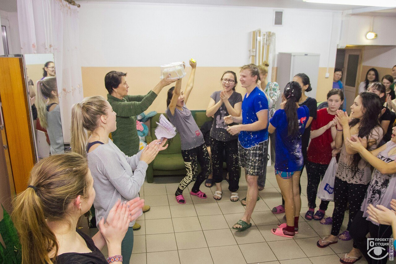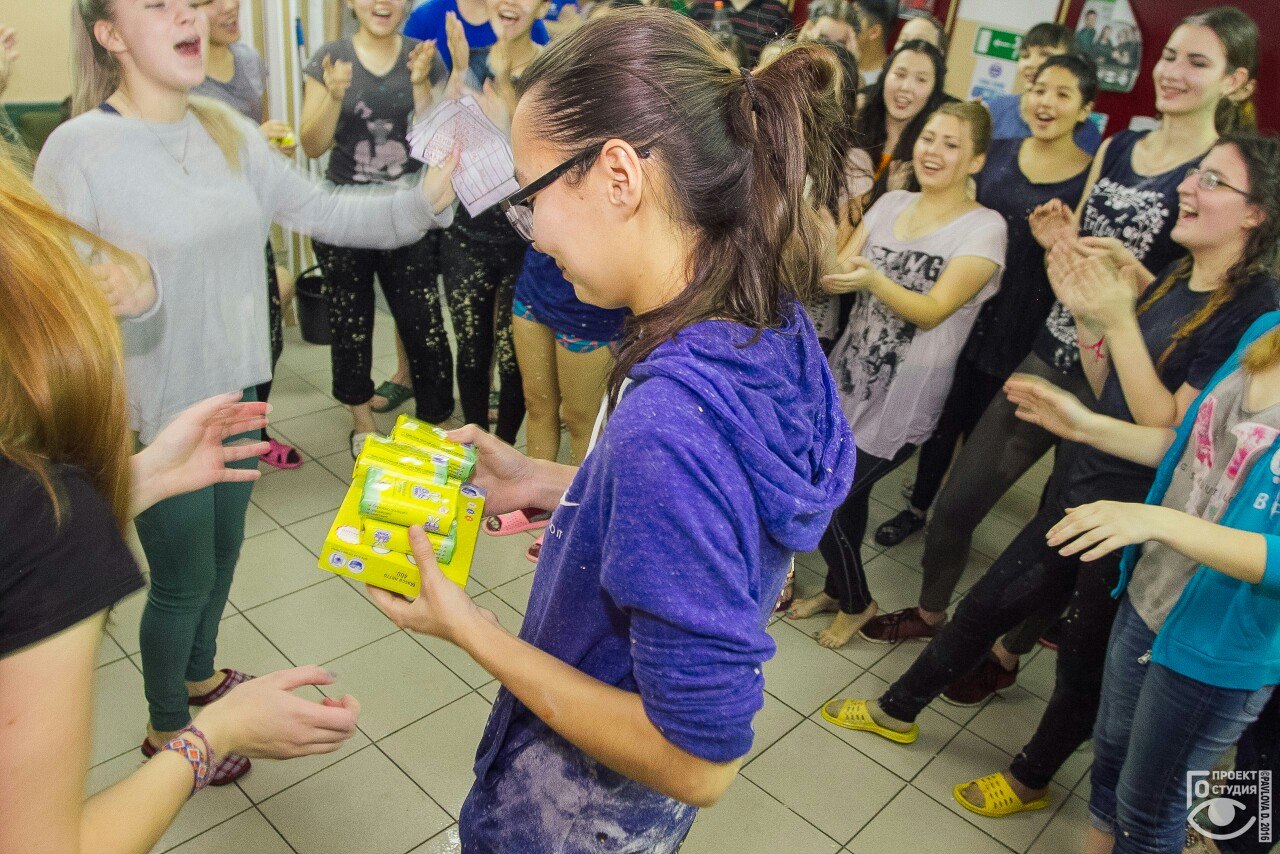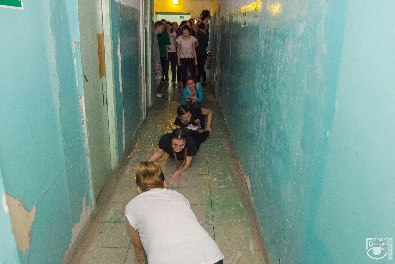Новоиспеченным жильцам пришлось ответить на каверзные вопросы по уставу общежития, прокатиться по мыльному коридору, попасть под дождь из кетчупа, моющего средства, муки, и даже накормить старшекурсников! И в конце концов, прийти на финиш перепачканными с ног до головы, мокрыми, уставшими, но с широкими улыбками на лицах и сияющими глазами!