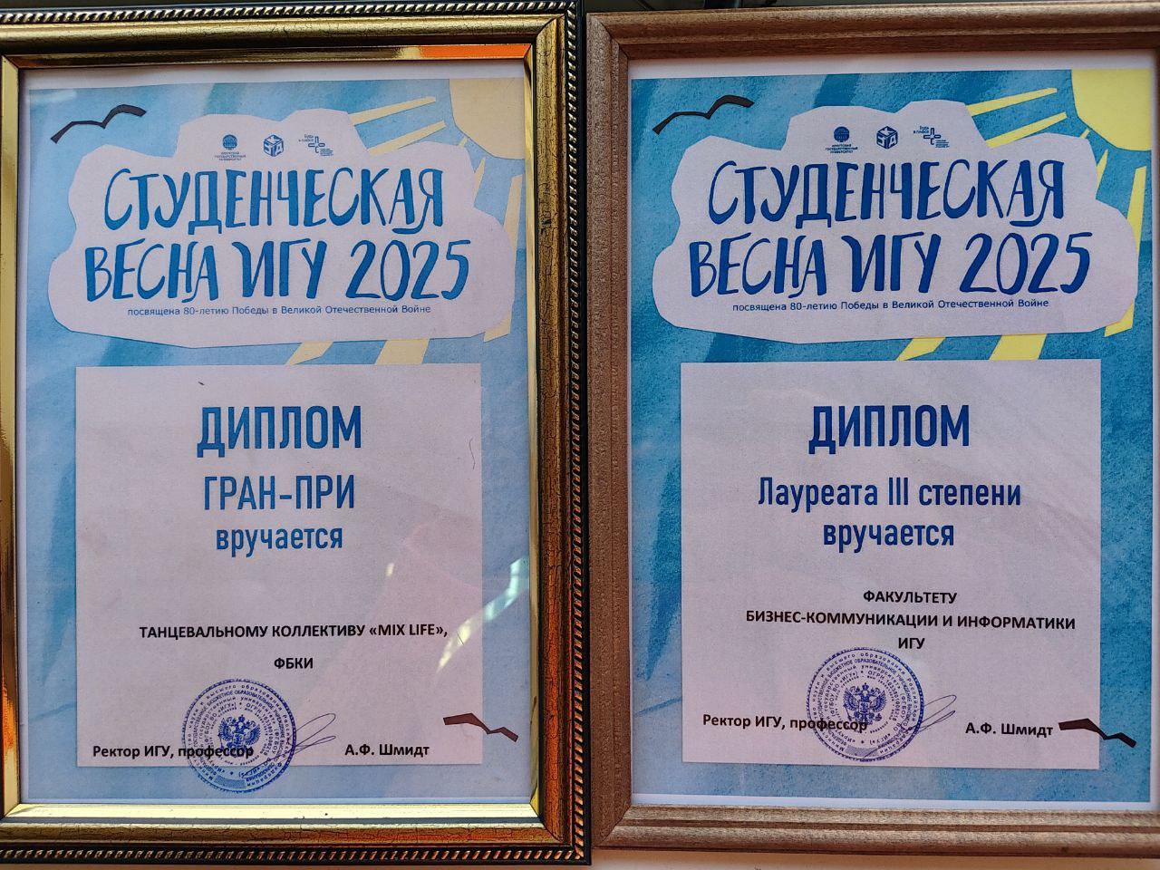 Гран-при фестиваля «Студенческая весна ИГУ-2025» и 1-е место среди творческих номеров ФБКИ ИГУ завоевал танцевальный коллектив факультета бизнес-коммуникаций и информатики Mix Life. Награждение состоялось 31 марта на гала-концерте.