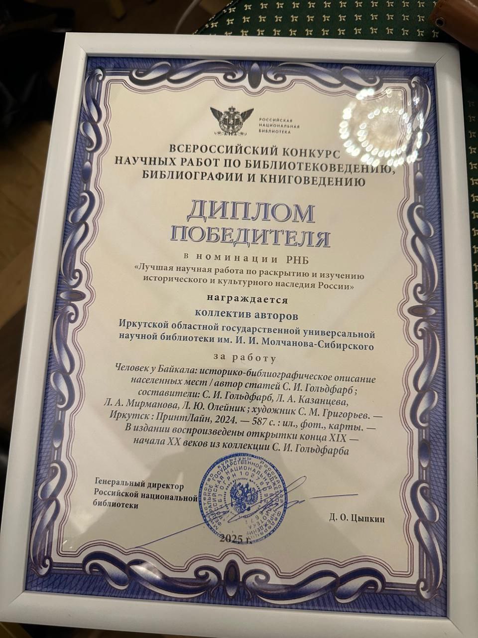 Церемония награждения состоялась 18 ноября в Москве. Книга «Человек у Байкала: историко-библиографическое описание населенных мест» стала лучшей в номинации Российской национальной библиотеки «Лучшая научная работа по раскрытию и изучению исторического и культурного наследия России».