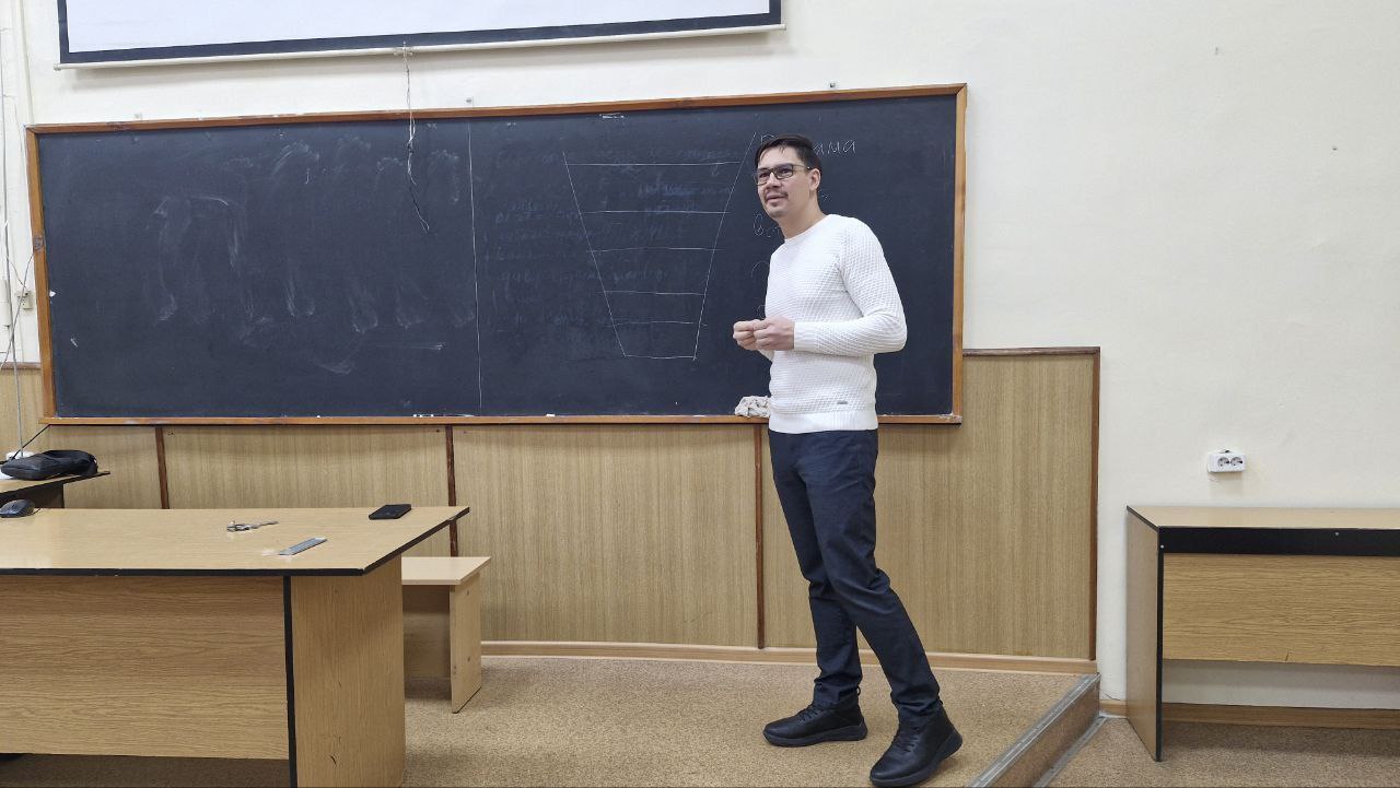 Дмитрий Салко на встрече с четверокурсниками поделился примерами из своего опыта работы, обсудил принцип воронки продаж и ее применение на практике, а также высказался о трансформации профессии маркетолога с развитием искусственного интеллекта.