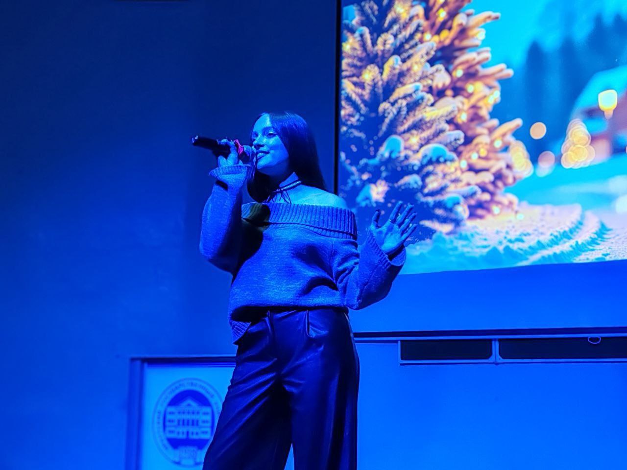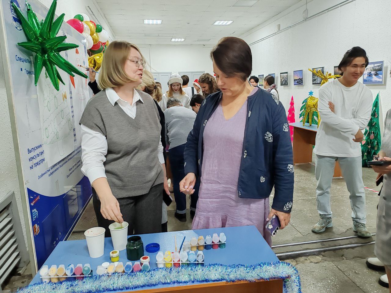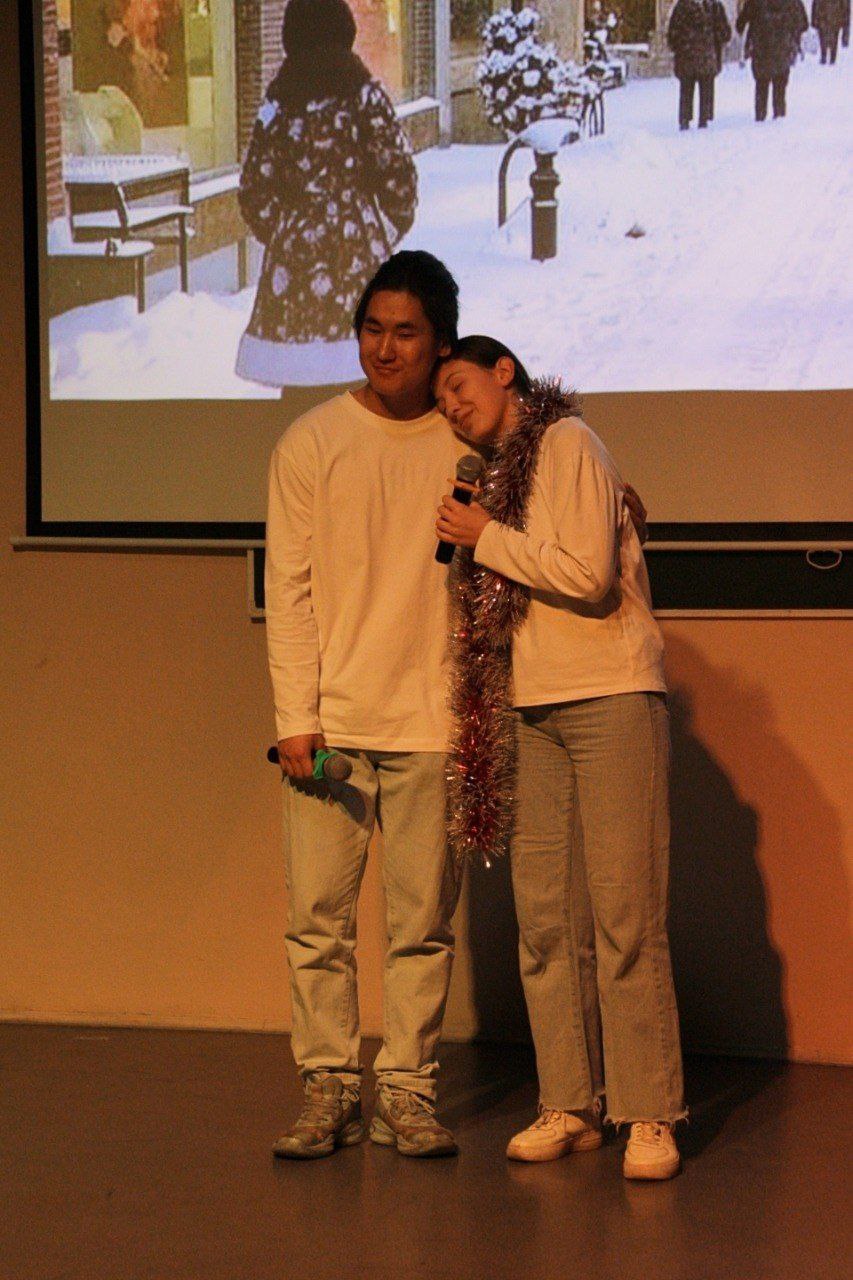 В этом году наши талантливые студенты подготовили праздничную программу под названием "Новогодний переполох". Перед началом действия зрители приняли участие в интерактиве: рисовали ёлку, Деда Мороза, писали пожелания и получали в награду мандарины.