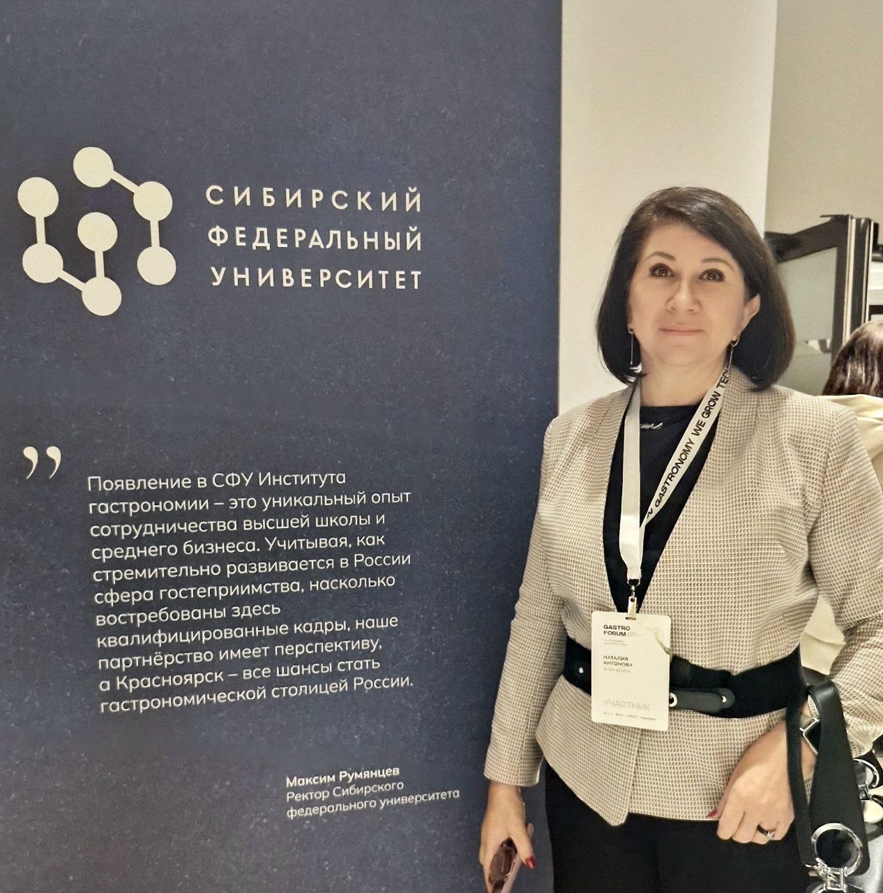 Во Всероссийском гастрономическом форуме Сибирского федерального университета «GASTRO FORUM 2024» приняли участие декан ФБКИ ИГУ Марина Георгиевна Синчурина, заведующая кафедрой сервиса и сервисных технологий Наталия Александровна Антонова и ассистент этой же кафедры Светлана Игоревна Середкина.