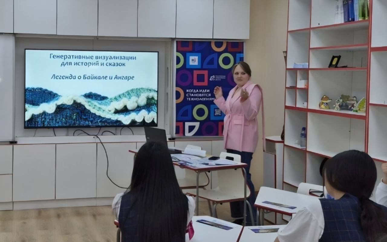 А Мария Андреевна рассказала о возможностях нейросети Qwen: от создания картинок до и их последующего анимирования. Её мастер-класс «Генеративные визуализации к историям и сказкам, на примере легенды о Байкале и Ангаре» продемонстрировал школьникам, как визуальный сторителлинг можно использоваться в сфере туризма.