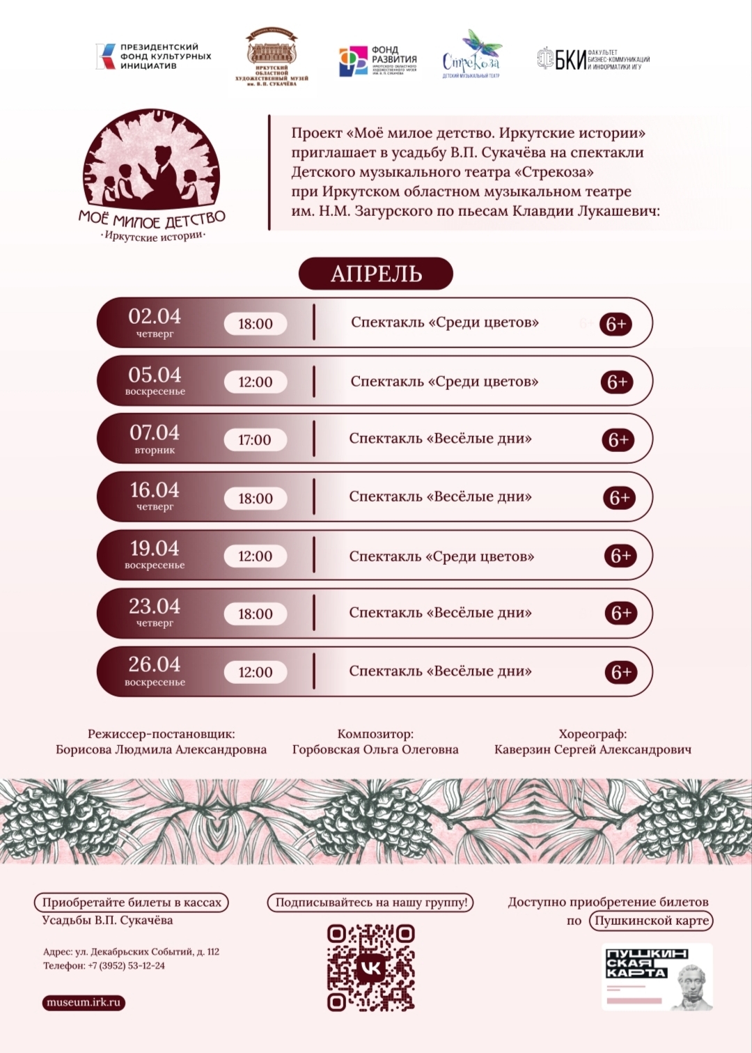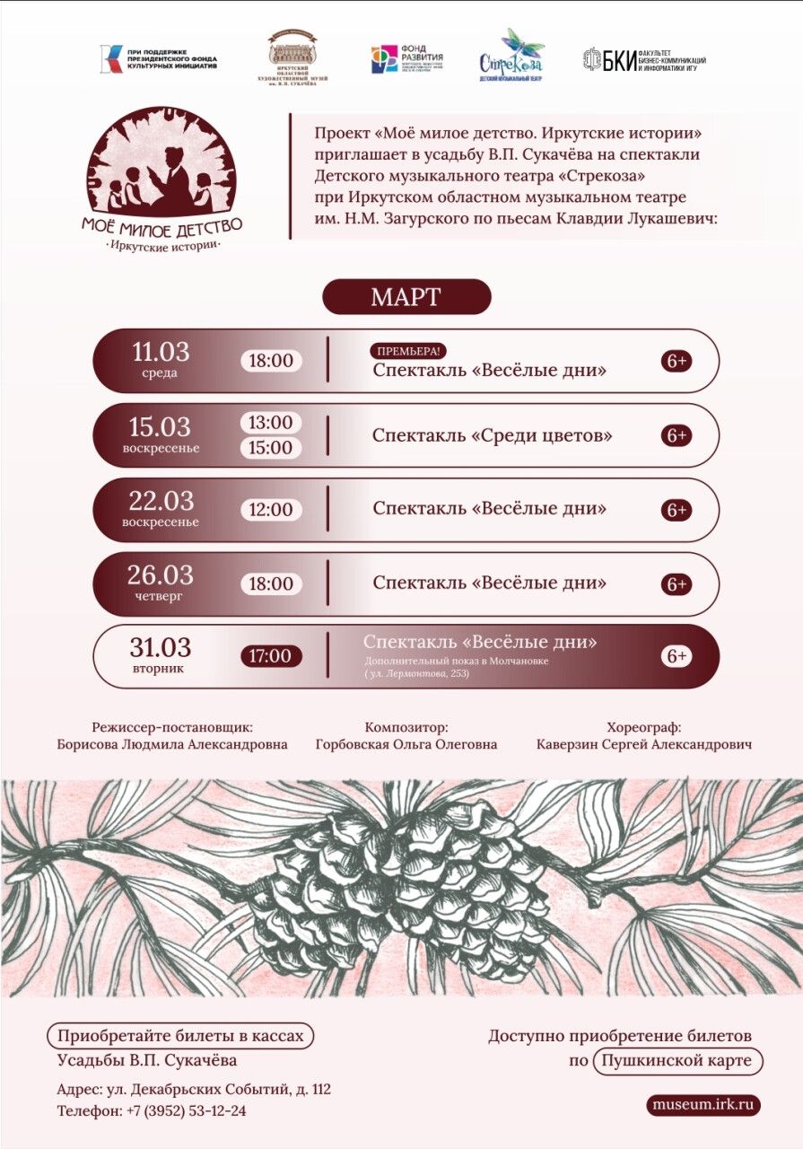 В марте и апреле организаторы приглашают юных зрителей и родителей в усадьбу Сукачёва на спектакли по пьесам Клавдии Владимировны, поставленные Детским театром «Стрекоза» при Иркутском областном музыкальном театре им. Н. М. Загурского. Ближайшие показы: