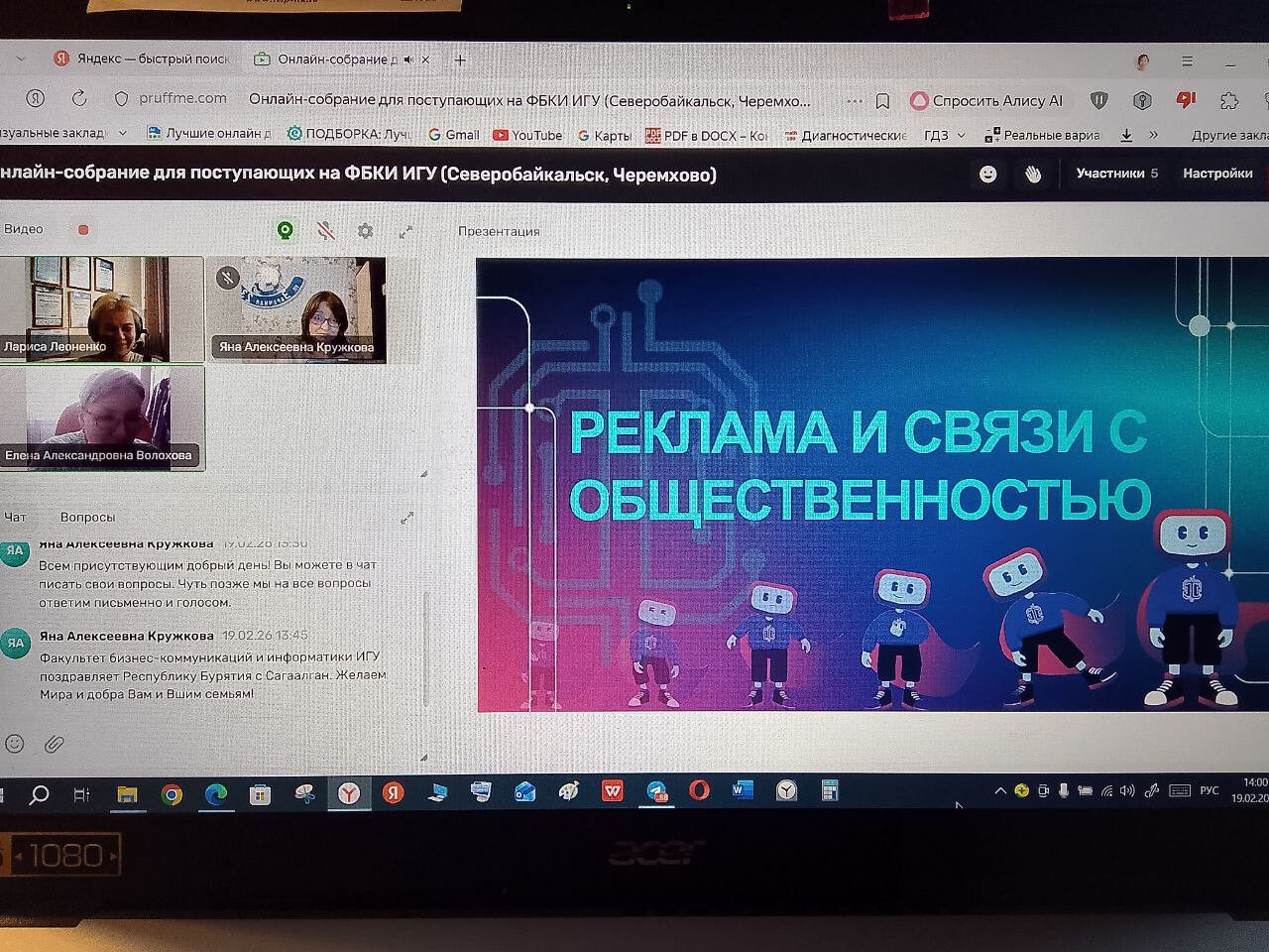 Профориентационную онлайн-встречу с учащимися 9-11 классов МАОУ "СОШ N3" г. Северобайкальска (Республика Бурятия) провели преподаватели факультета бизнес-коммуникаций и информатики ИГУ. В мероприятии приняли участие 65 школьников.