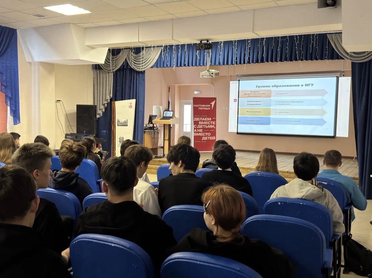 Замдекана ФБКИ ИГУ Лариса Валентиновна Леоненко, завкафедрой предпринимательства и управления в сфере услуг и рекламы Елена Александровна Волохова и старший преподаватель кафедры сервиса и сервисных технологий Яна Алексеевна Кружкова представили Иркутский государственный университет, рассказали о правилах приёма 2026 года, направлениях подготовки ФБКИ ИГУ, студенческой жизни и перспективах трудоустройства выпускников факультета.