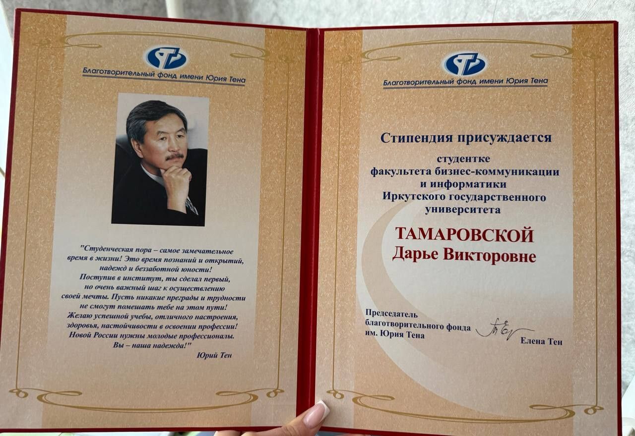 Именной стипендией Благотворительного фонда имени Юрия Тена награждена студентка 3 курса направления «Прикладная информатика» ФБКИ ИГУ Дарья Тамаровская.