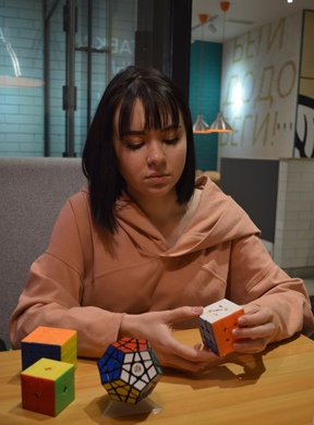 Екатерина Мужева, 2 курс, «Реклама и связи с общественностью». — Занимаюсь своим любимым делом один год. Увидела, как папа пытался собрать кубик рубика и решила тоже попробовать. Позже узнала про скоростной метод сборки. И понеслось… Теперь у меня есть маленькая коллекция головоломок.