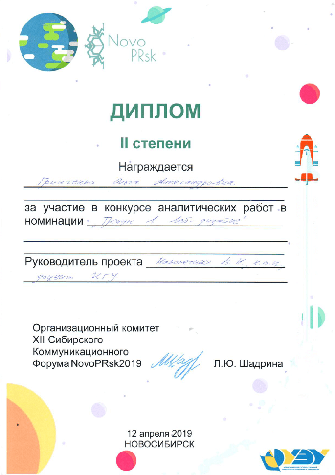 Студентка 1 курса направления «Реклама и связи с общественностью» Ольга Гринченко была награждена дипломом II степени в номинации «Тренды в веб-дизайне». 12 апреля на базе Новосибирского государственного университета экономики и управления состоялся XII Межгалактический Форум «NovoPRsk-2019», реализуемый в партнерстве с органами власти, представителями бизнес-структур и общественными организациями. Каждый год в нем задействованы свыше 600 студентов из России и стран Ближнего Зарубежья. Участники обсуждают актуальные вопросы в области коммуникаций, делятся опытом и намечают пути решения поставленных проблем. Традиционно проводится конкурс студенческих научных работ, где можно принять участие не только очно, но и заочно. Главное условие — предоставить самостоятельно выполненную аналитическую работу на тему этого года: «NEOмаркетинг: тренды, кейсы, эффективность». Работа нашей студентки посвящена поиску эффективных методов преодоления влияния феномена «баннерной слепоты» на поведение молодежи. Научный руководитель — и.о. зав. кафедрой туризма, доцент, кандидат педагогических наук Валентина Николаевна Наконечных. «Мне понравилось заниматься научной деятельностью. Ведь даже в такой прикладной науке как реклама есть над чем задуматься и что изучить. Например, моя работа доказывает, что и избитые рекламные приемы могут заиграть новыми красками при нестандартном подходе,» — отмечает Ольга. Желаем нашим будущим ученым не останавливаться на достигнутом и двигаться к новым вершина!
