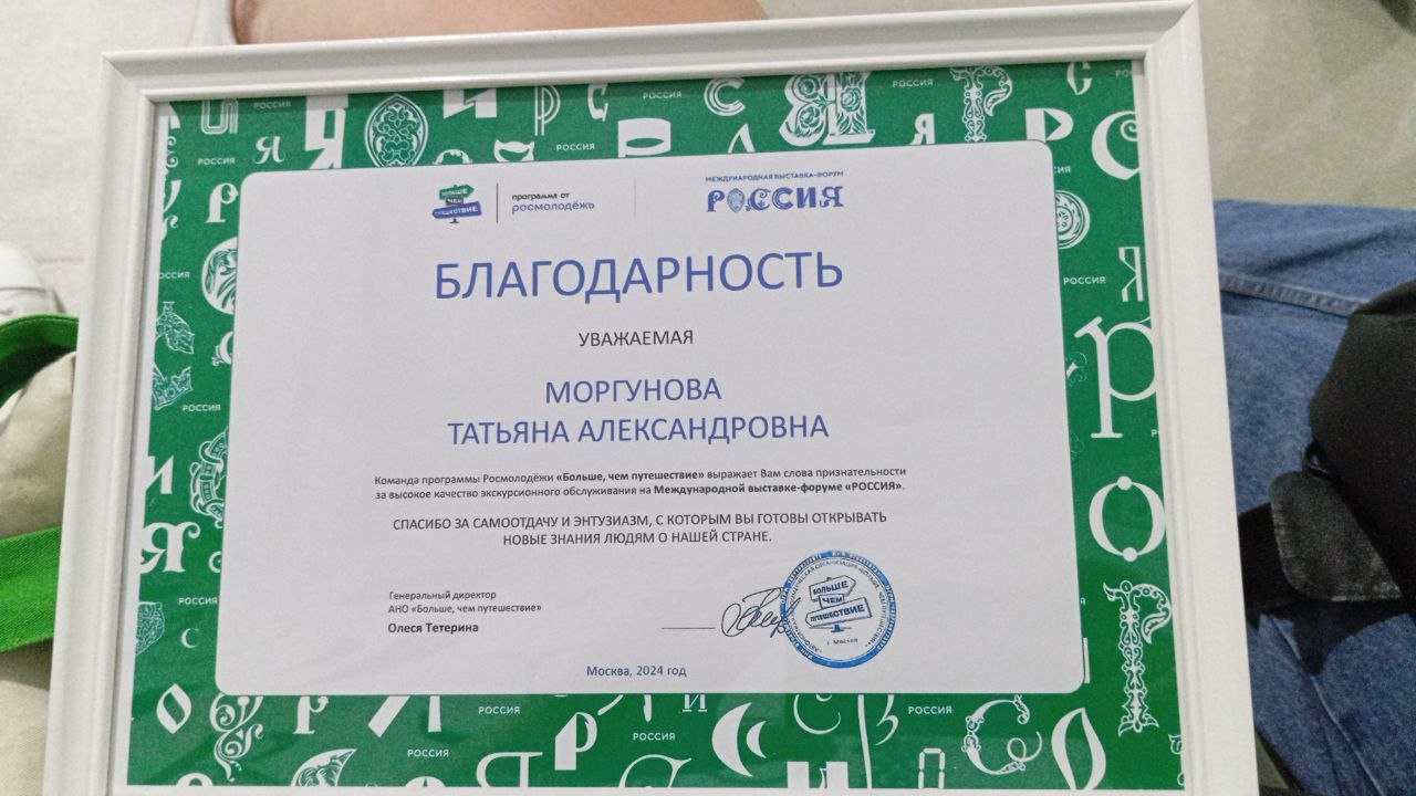 Доцент Татьяна Александровна Моргунова попала в десятку лучших гидов заезда за высокое качество экскурсионного обслуживания на выставке и получила благодарность от команды программы Росмолодежи «Больше, чем путешествие» за самоотдачу, энтузиазм и готовность открывать людям новые знания о стране.