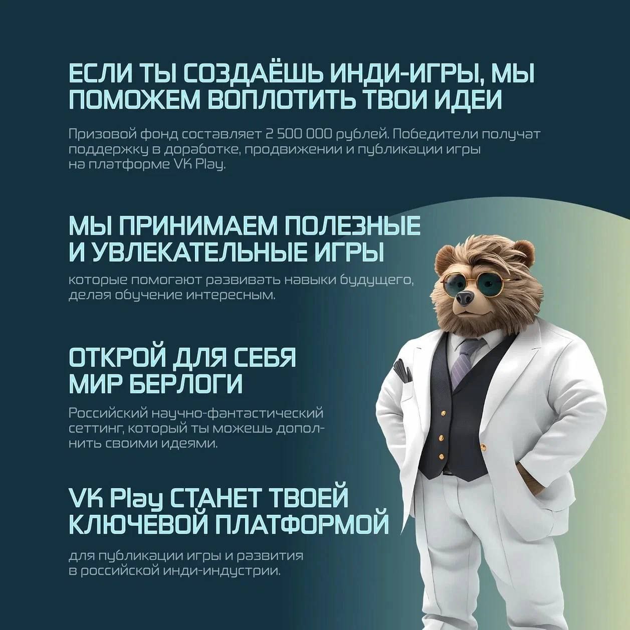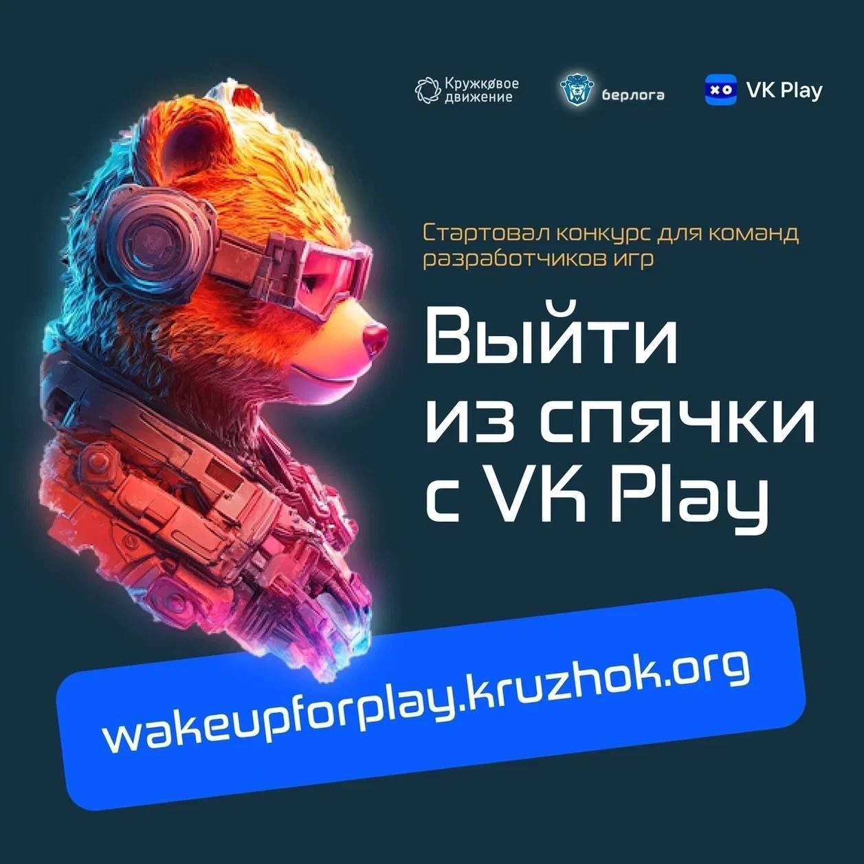 *Конкурс «Выйти из спячки с VK Play» проводится в рамках Всероссийского конкурса фантастики и проектирования будущего в сеттинге «Берлога» и нацелен на поддержание творческих людей, создающих компьютерные, мобильные и браузерные игры. Организаторами выступают Кружковое движение Национальной технологической инициативы, Национальная киберфизическая платформа «Берлога» и VK Play.