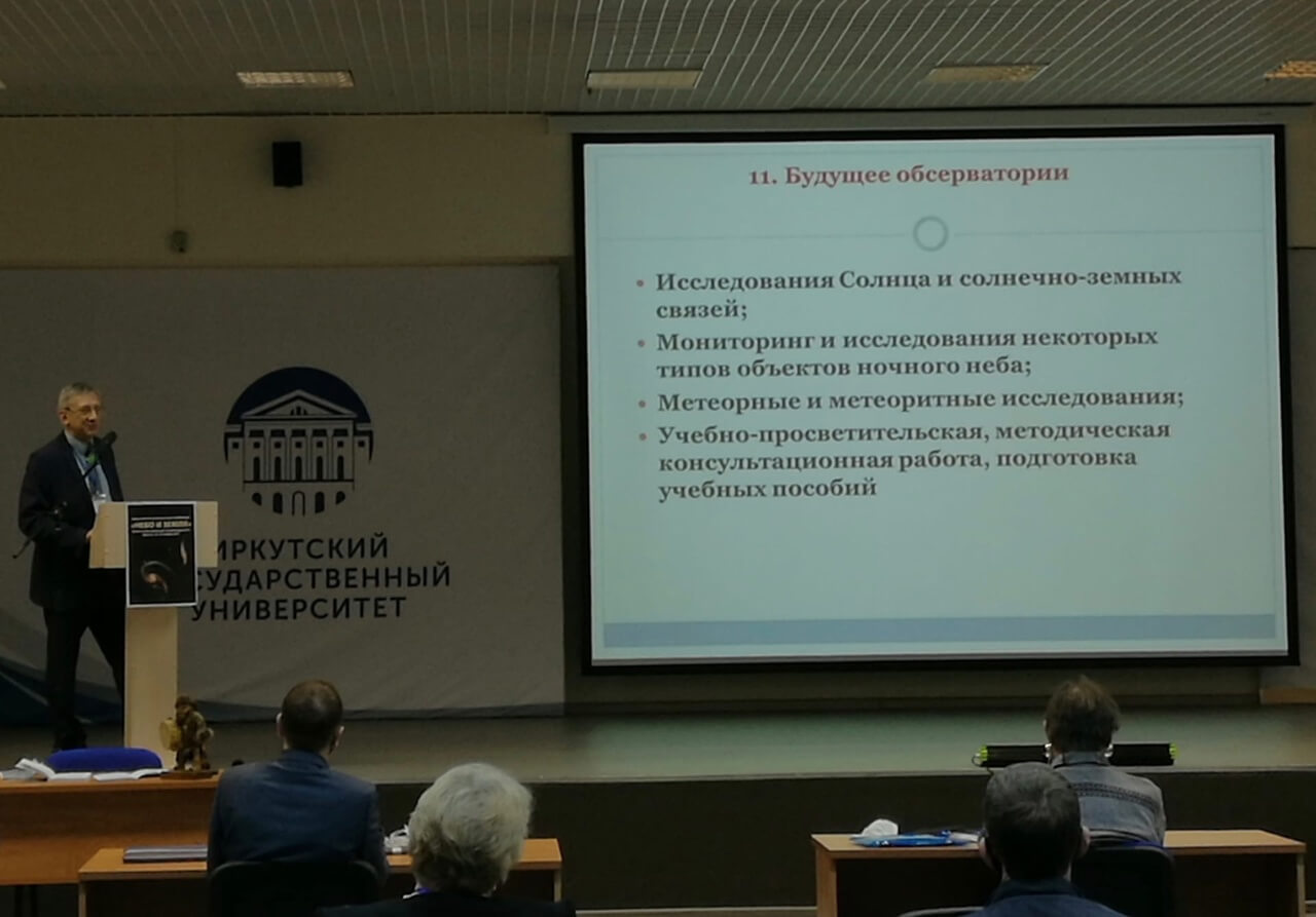 Директор астрономической обсерватории ИГУ, ведущий научный сотрудник НИИ прикладной физики ИГУ, старший научный сотрудник Института солнечно-земной физики СОРАН, доктор физико-математических наук, профессор ИГУ Сергей Арктурович Язев посвятил первый доклад страницам истории, основным итогам работы обсерватории и перспективам дальнейшего развития. Состоялся предпремьерный показ нового фильма Иркутского областного кинофонда «130 мм до космоса», посвященного историческому иркутскому телескопу-рефрактору, который представила заместитель директора кинофонда Е.В. Утробина Своими впечатлениями от участия в конференции поделились студенты группы 14 271 направления подготовки «Туризм». Маргарита Поднебесова рассказала: — В байкальском регионе проводится много научных исследований в рамках российских и мировых научных астрономических проектов. И мы в этом убедились, познакомившись с программой конференции и географией места работы прибывших на конференцию участников.