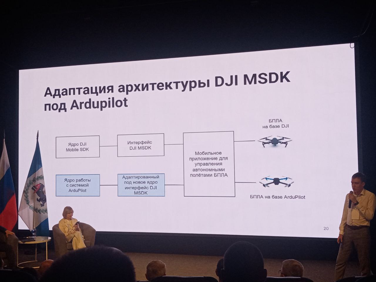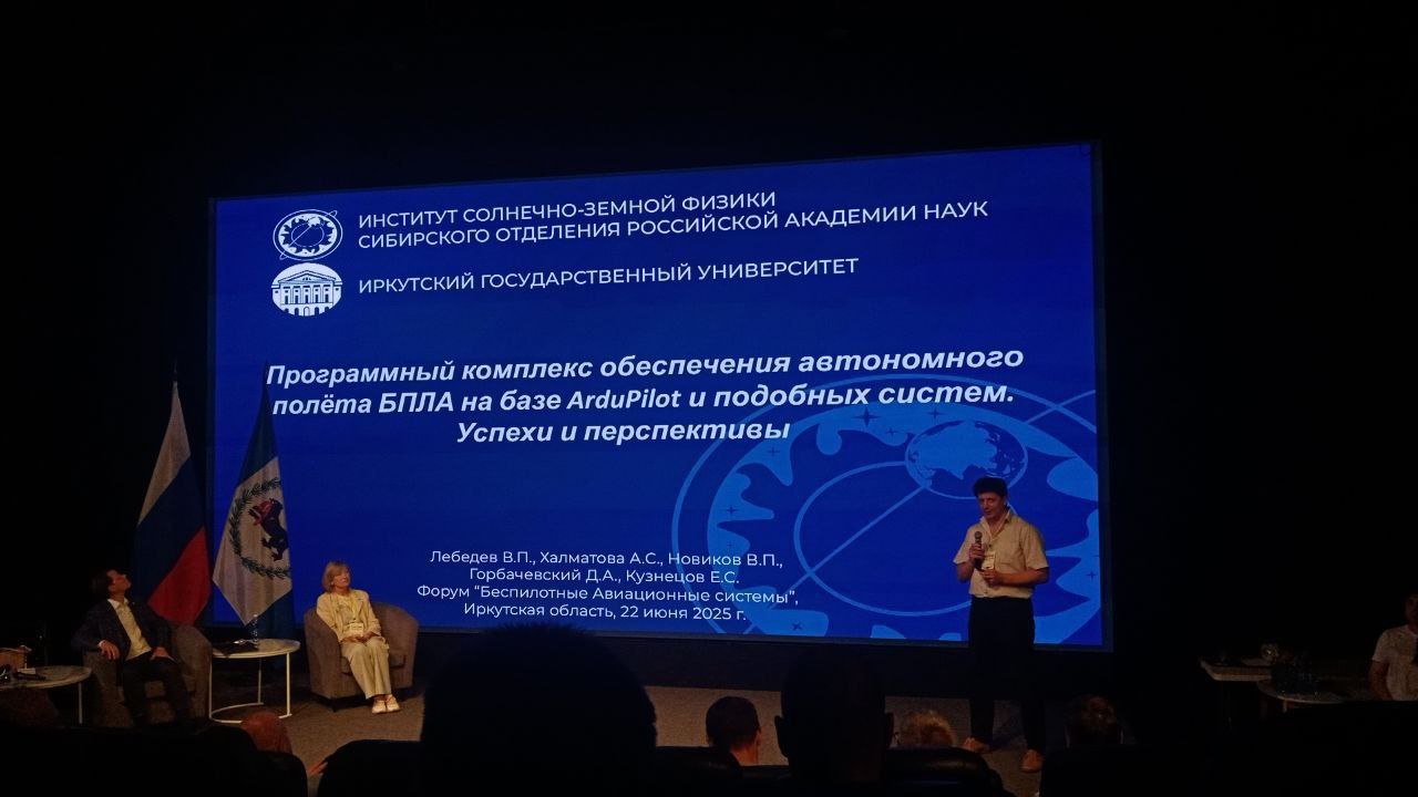 Студенты направления «Прикладная информатика» Даниил Горбачевский, Владислав Новиков, Егор Кузнецов, выпускница ФБКИ ИГУ, магистрант ИСЗФ СО РАН Алёна Халматова и доцент кафедры естественнонаучных дисциплин ФБКИ ИГУ, заведующий лабораторией радиофизических методов диагностики околоземного космического пространства ИСЗФ СО РАН, к. ф.-м.н Валентин Павлович Лебедев создали ряд программных продуктов для БПЛА на базе ArduPilot, которые представили на форуме.