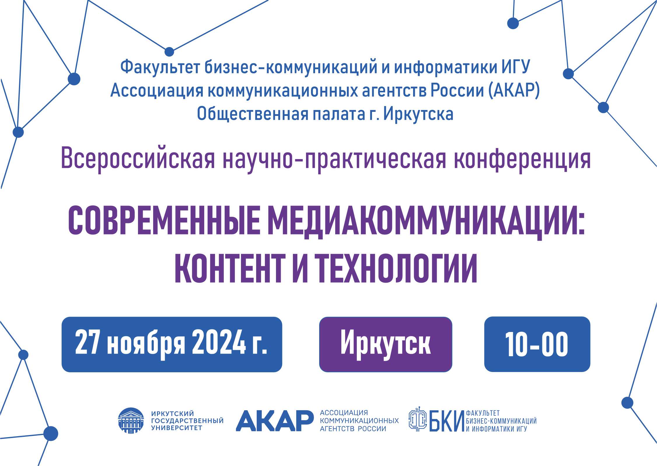 27 сентября 2024 г. в Иркутском государственном университете на факультете бизнес-коммуникаций и информатики состоится Всероссийская научно-практическая конференция «СОВРЕМЕННЫЕ МЕДИАКОММУНИКАЦИИ: КОНТЕНТ И ТЕХНОЛОГИИ».
