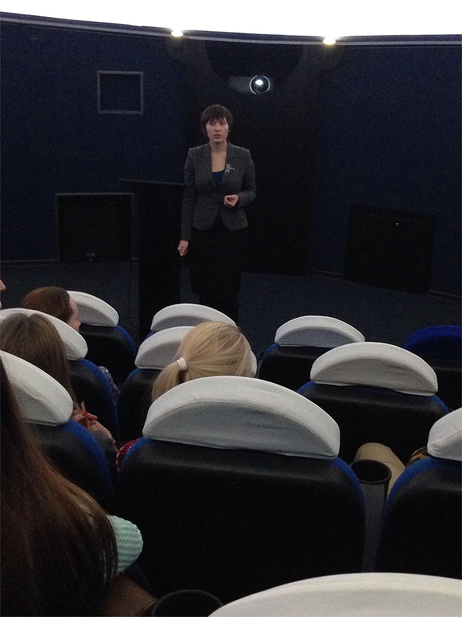 Пресс-секретарь музея «Ноосфера» Евгения Скареднева рассказала об экспонатах музея. Будущим специалистам в области рекламы и PR-технологий были представлены методы продвижения музея с помощью организации специальных мероприятий, среди которых выездные ночные наблюдения звездного неба, различные городские акции. Кроме этого, для популяризации астрономических знаний используются площадки в социальных сетях, в настоящий момент очень активно растет группа «ВКонтакте». Студенты узнали, что прямую рекламу музей «Ноосфера» практически не использует. Мультимедийный музей, астрономическая обсерватория и планетарий на 45 мест работают как единый комплекс, созданный при помощи ГК «Метрополь». В качестве подарка от планетария студентам был показан полнокупольный фильм «Энергия Вселенной» о научных космических наблюдениях современных обсерваторий. Премьера фильма состоялась несколько дней назад — 2 декабря в «Ноосфере», во время нее была установлена видеосвязь с молодым режиссером фильма - Теофанисом Матсопулосом (Греция). По словам студентов факультета сервиса и рекламы, визуальные эффекты, музыкальное сопровождение в фильме, полусферический экран произвели на них сильное впечатление. Это одновременно современная форма передачи высокоточных научных знаний о космосе и незабываемое 3D-шоу. Занятие было полезным еще и потому, что традиционная Летняя школа компьютерных и коммуникационных технологий следующим летом планируется на тему космоса и будет связана как раз с созданием полнокупольных фильмов.
